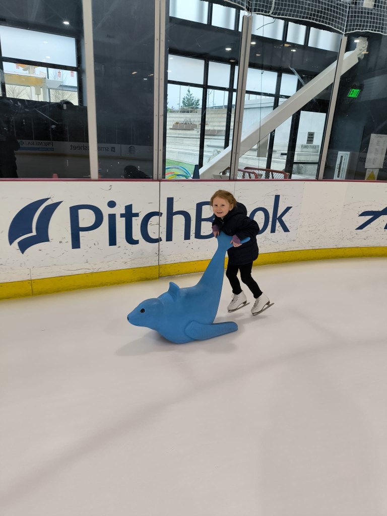 Lady Kitty has been gaining in confidence on the ice. LinnĂŠa, Theresa, Amie and Lena have all taken Lady Kitty ice skating here and there over the past few years. Lena, though, found a free tots hour on Monday mornings so between Amie, Lena and Tom, Lady Kitty been skating consistently this winter. She adores it and has earned her own pair of skates.