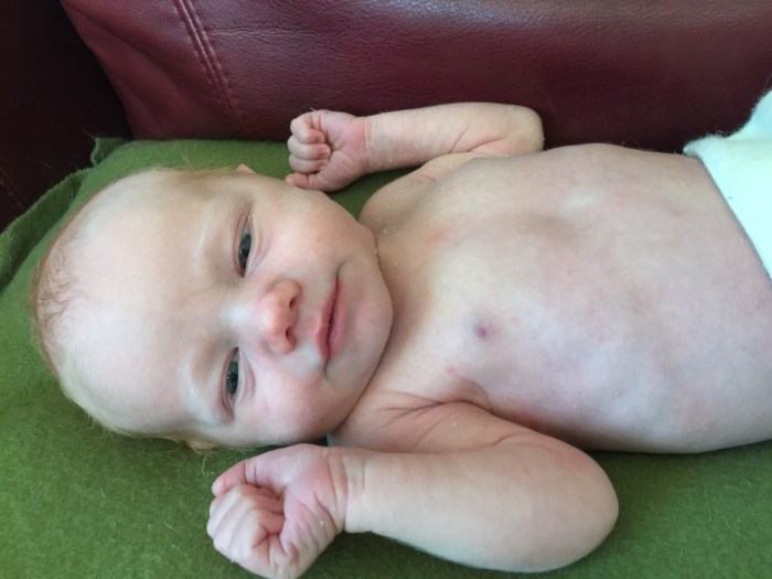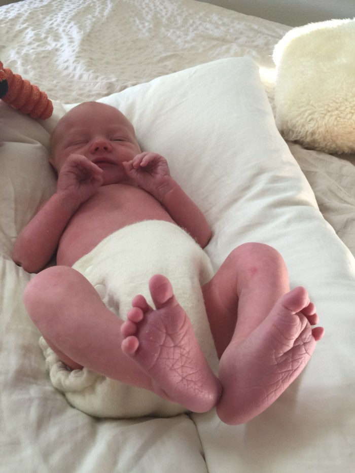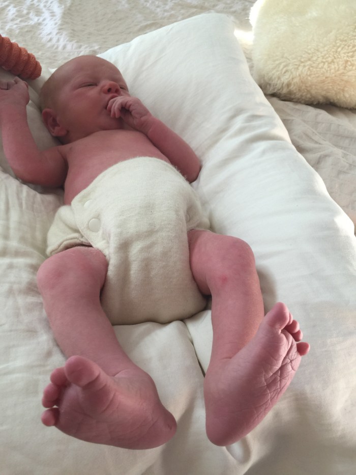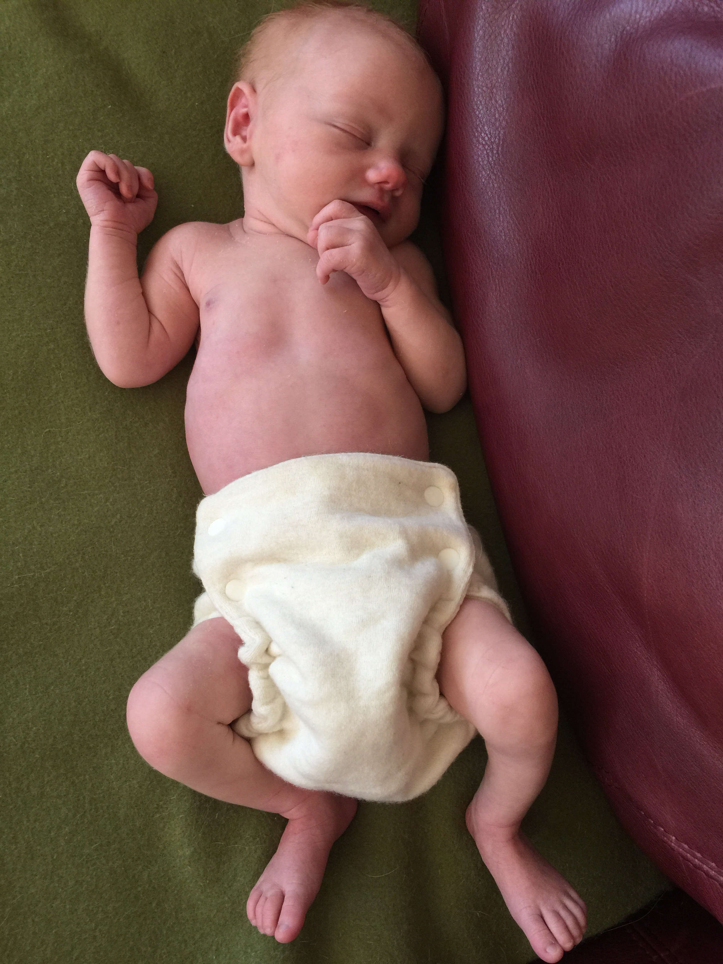 “The nursing staff was really strong on us using disposable diapers until the belly button heals over. It seems highly unlikely a necessity since disposable diapers have not been around since the birth of man. But maybe it’s the best thing to try out now. I really like the diaper service diapers and his little wool diaper covers. He seems so cozy in it, and no skin irritation or anything.”