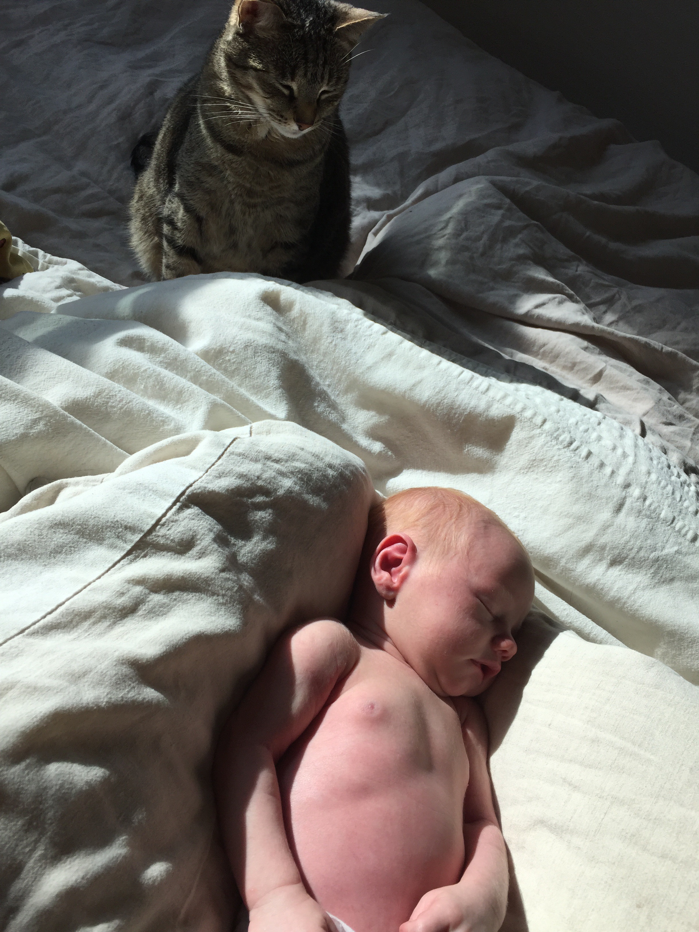 Now, a little more than a week has passed since we all arrived home, and the honeymoon period seems to be waning. Mr. Cat was the first to break the hallowed baby territory quarantine by plopping directly down on all the diapering supplies at the diapering station. Cozy! And Mr. Cat is creeping in closer to watch over him.