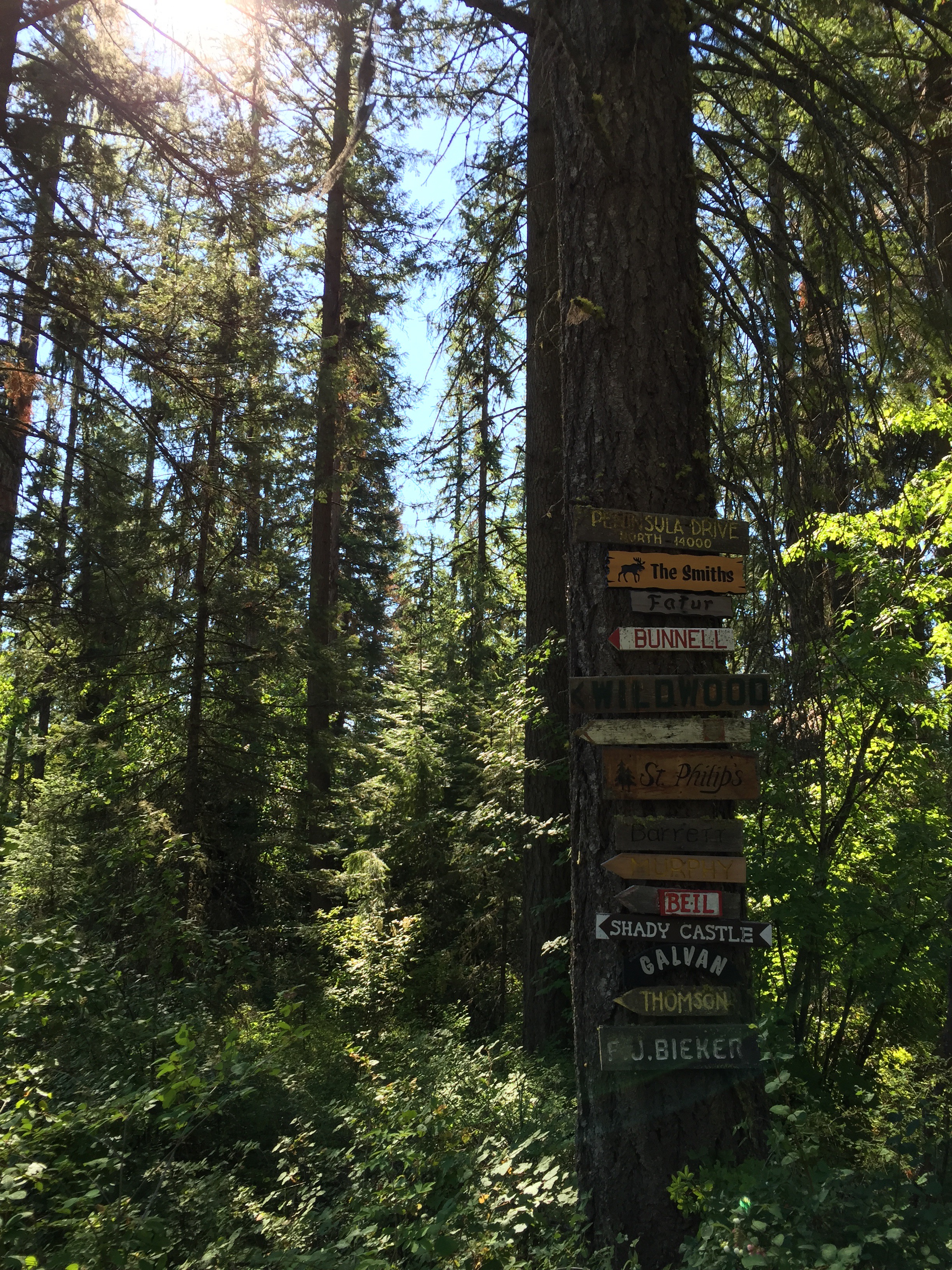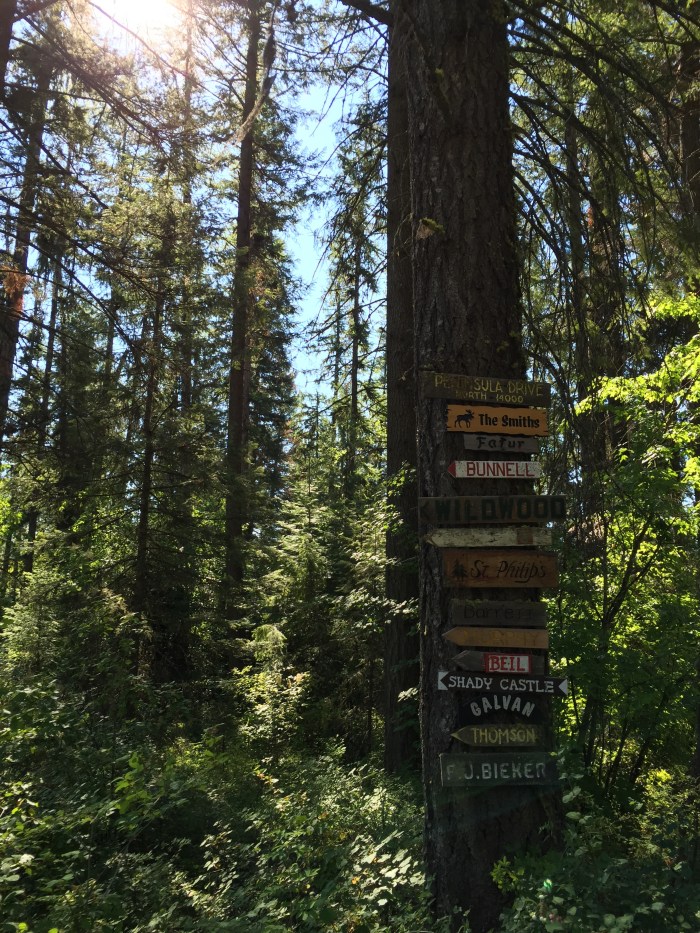 We set out under dubious skies. Nana accessorizes with a fleece and rain jacket and I with my straw hat and sunglasses. It feels like the weather could go either way, and most probably both ways given sufficient time. The impetus for our excursion was to take a piece of outgoing mail up the mailbox. Friday had been thus far a pretty off and on rainy day overall. We had a fire going inside in the fireplace and a we enjoyed a leisurely brunch. Our cabin is at the end of a long shared gravel driveway, and it’s a short walk up to the paved peninsula road where the cluster of mailboxes and newspaper boxes reside. So getting the bill in the mail was our overt objective, but the covert aim was more that it was an excuse for a walk to liven up our day.