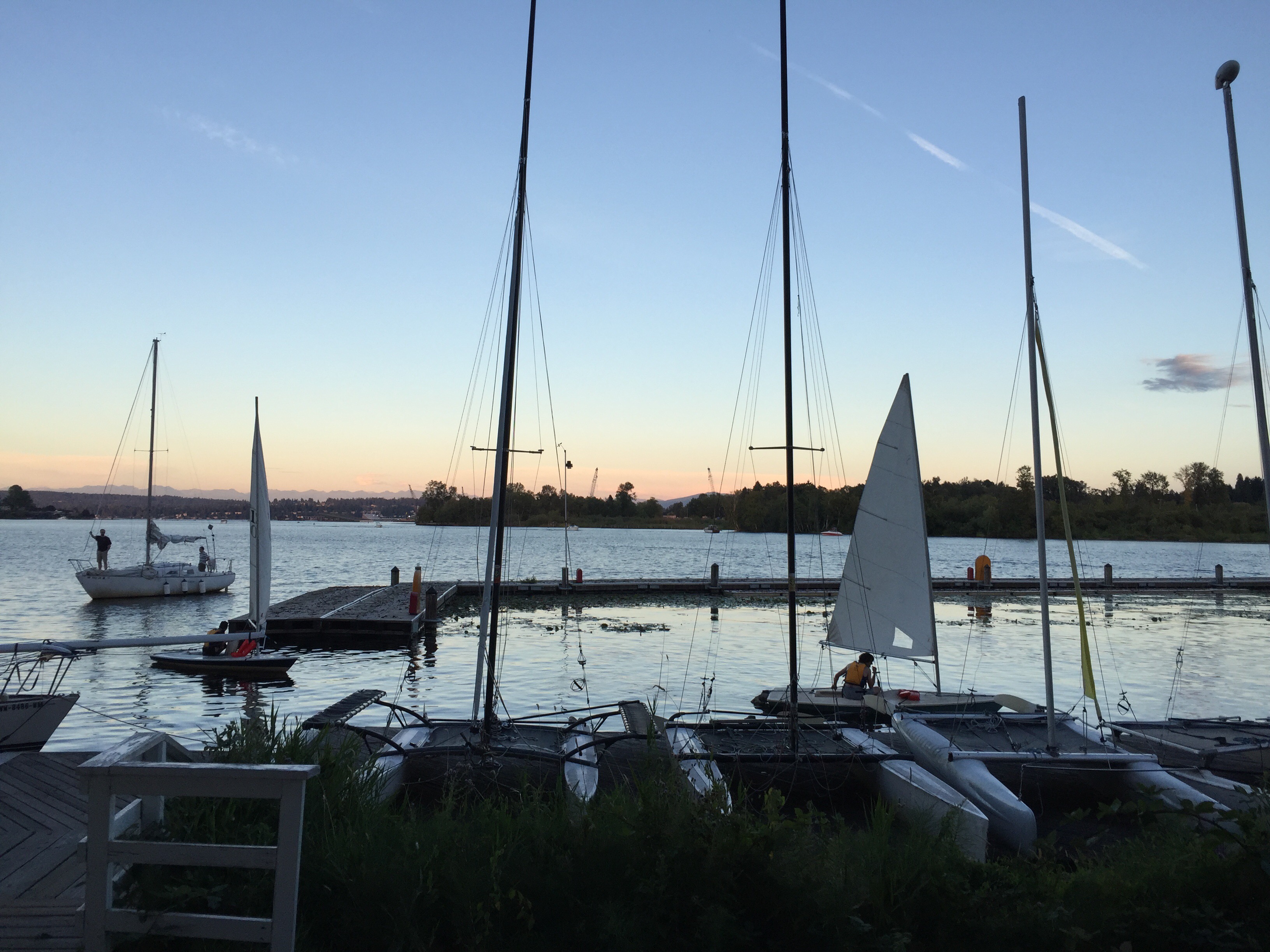 Sunset on the Cascades and the Lake Washington boats sail in for the nightLast evening Lake and I shared a few peaceful transition moment down on Lake Washington by the UW Waterfront Activities Center. This warm evening reprieve from the hot day was especially refreshing coming after a long and difficult 24 hours of distinctly non-“Newman Lake time” yesterday. We had a rough close of day Sunday night encountering significant congestion from Cle Elum home due to construction and accidents, then juggling the unloading of the car with Lake unhappy to be helping and unhappy to be sitting it out too. The next day post-holiday Blues of unpacking, house cleaning, and grandparent withdrawals set in. Not having Nana and Grandpa’s extra sets of loving hand and heart and smiling interfaces around put us in a challenging adjustment period of being back home in the city.