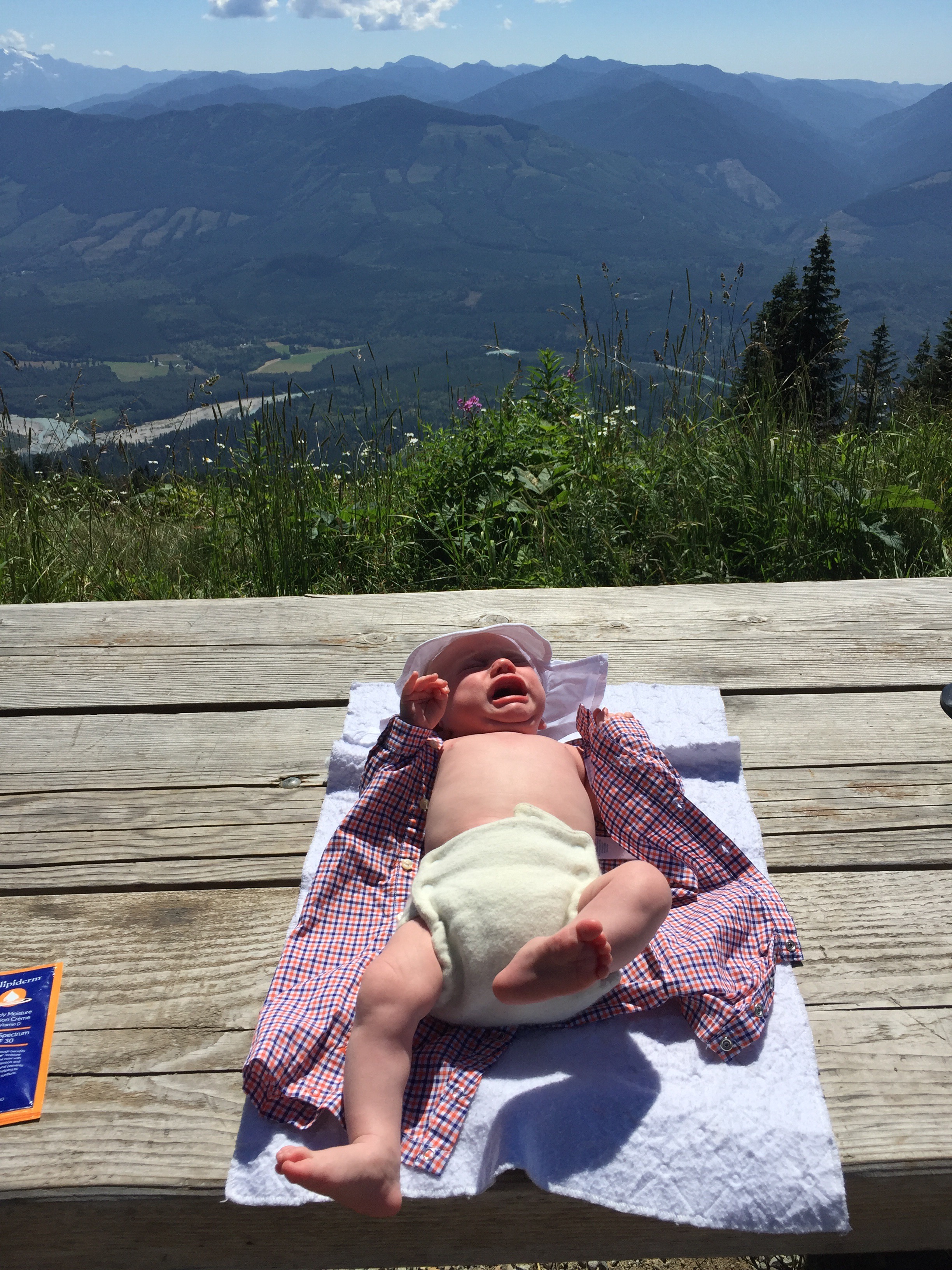 The intensity started right out of the gate. Lake had suffered a blow out, so poo is dripping between him and his car seat when I extract him from the car. There is not a drop of shade in the parking lot, and what it lacks in amenities it makes up for with biting deer flies. We manage to get cleaned up, and sun screened and bug repellent-ed using the picnic table as our comfort station… I don’t have a square centimeter left on my body by the time I’m done that’s not been bathed in about three different layers of sunscreen and insect repellent. The midday sun at this elevation presses into me with a sense of emergency. I’m anxious for shade, a quiet baby and no flies.