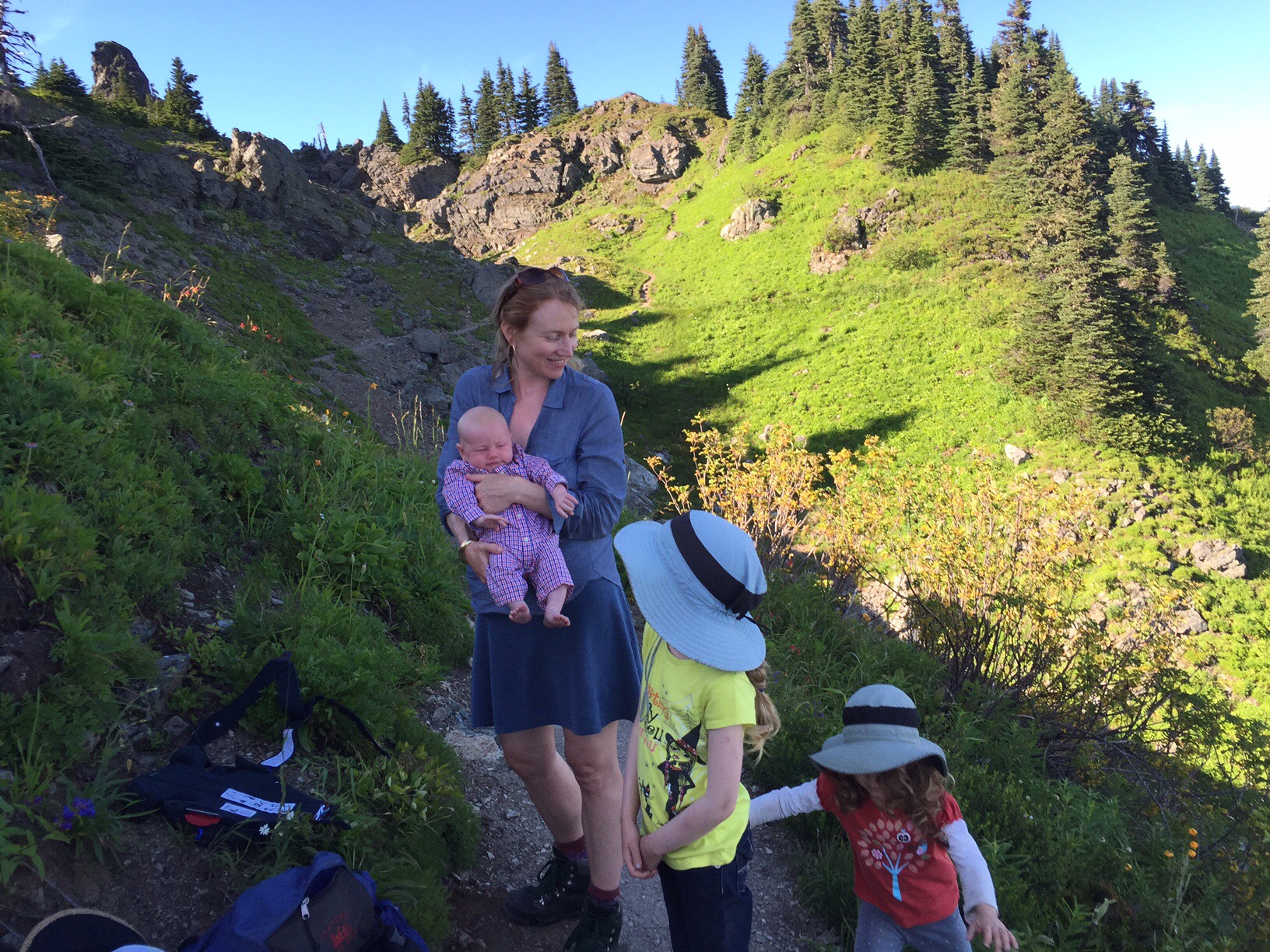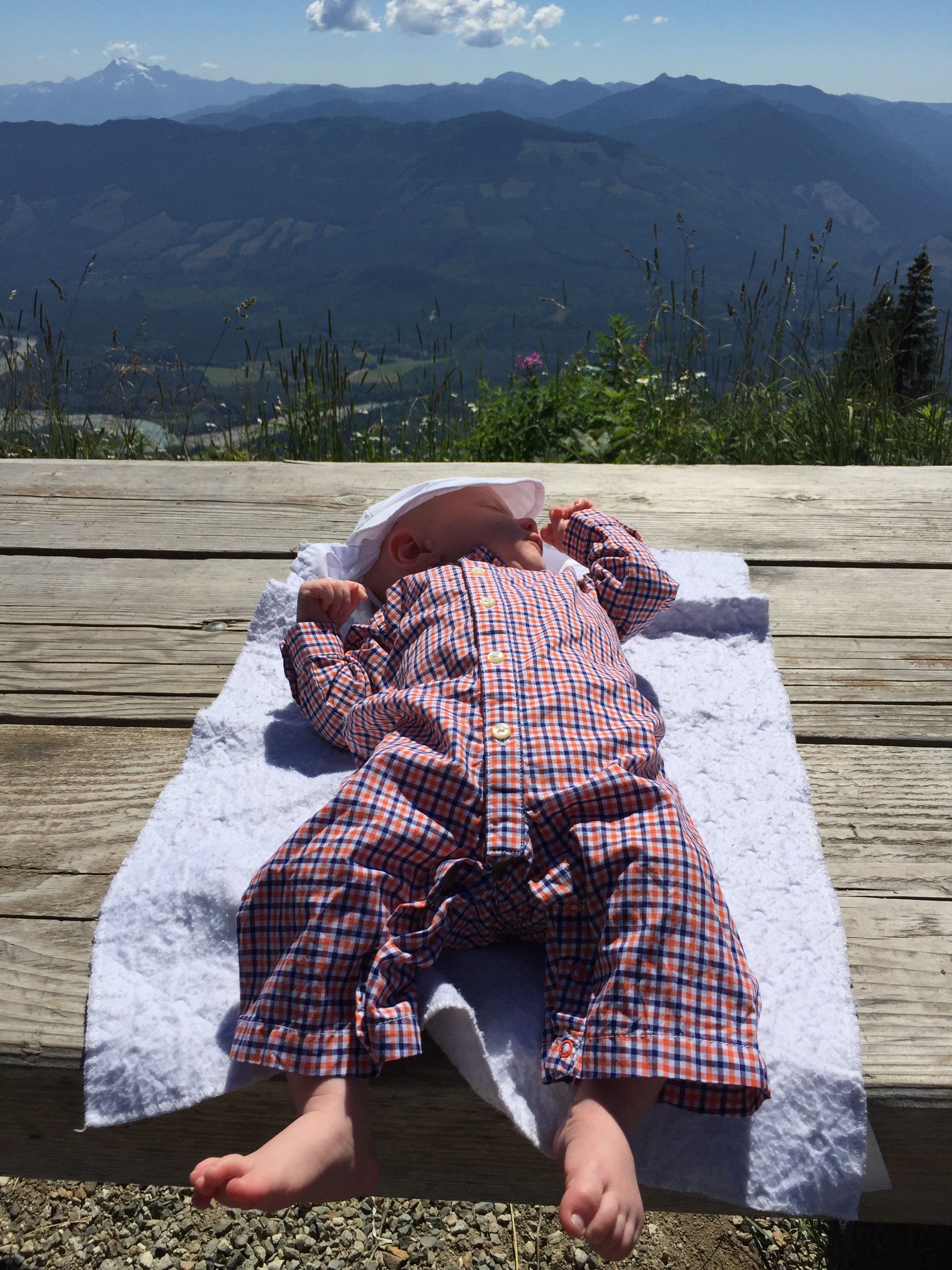 We made it back down to the trailhead in just one hour. Safe and sound. We were the last car in the lot. It was cooler, there were fewer flies, and I was significantly less addled when performing the perfunctory picnic table nappy change and Lake refueling. What a day! Katie had driven and so it was a luxury to have to girls to provide “in-flight” entertainment for Lake in the form of peek-a-boo, singing songs, admiration and general goings ons. He was engaged and quiet for the car ride home. Refreshed after his “nature bath,” oblivious to the fretting of his mummy, he was completely content. A strong hiker. A perfect day. More to come. We are glad we spent this one with you.