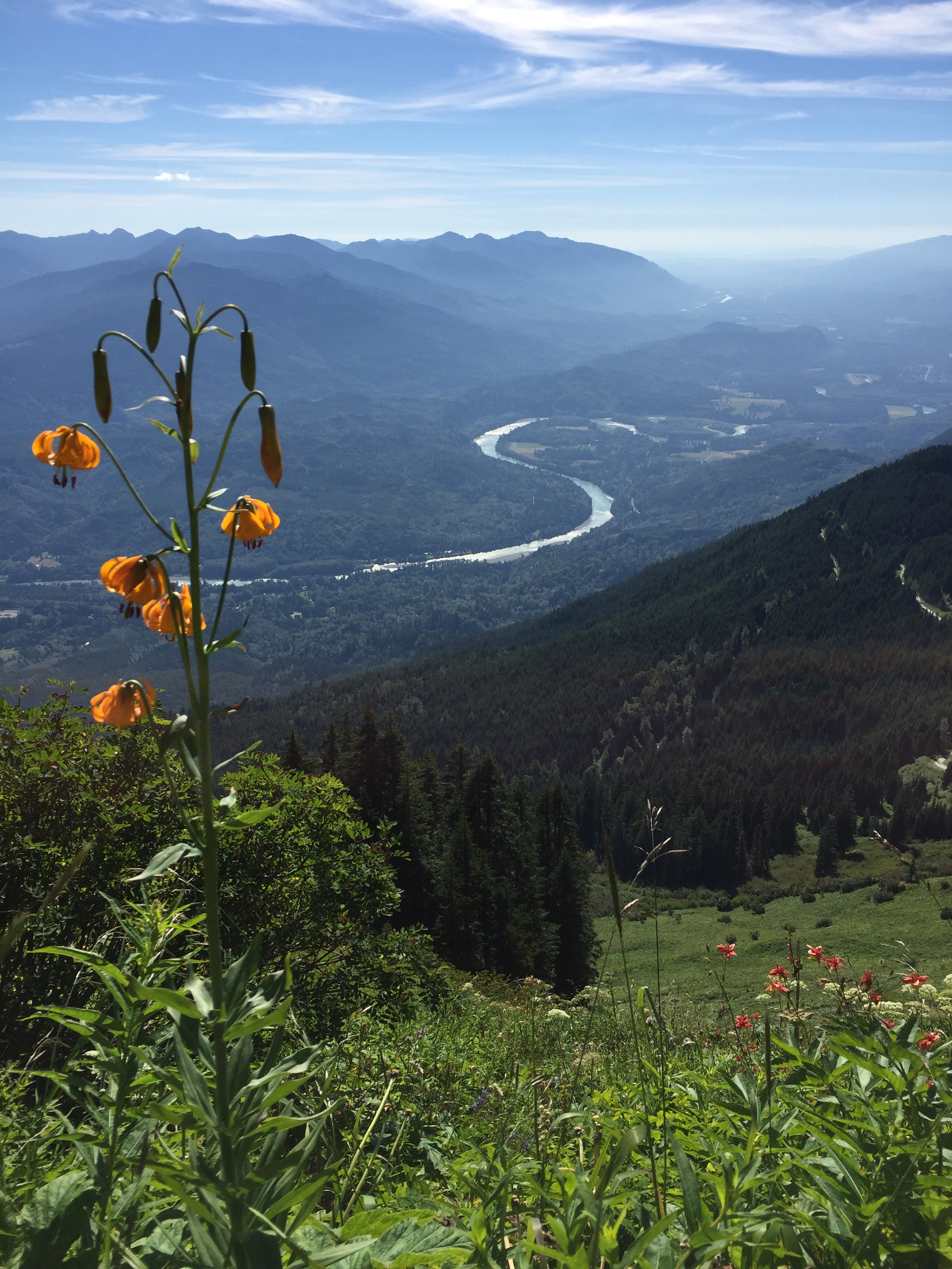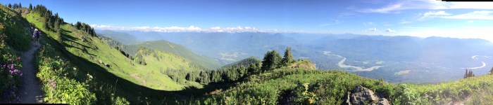 They are not kidding. The tread is significantly deteriorated by erosion to the point it is only marginally safe at best. And here I am with Lake in the front pack and as much water as I could carry in my backpack, doing my inaugural dayhike since Michael proposed at Gem Lake last year. My symphysis pubis is not yet fully rejoined. I still have ligament pain and instability in my sacroiliac joints and my core, in spite of my best efforts to the contrary. I’m all top heavy. It’s super hot and the deer flies are ubiquitous and biting! Unfortunately the view is absolutely stunning from Mt. Rainier to Mt. Baker. Heaps of wildflowers in prodigal bloom. Obscene amounts and variety of butterflies.