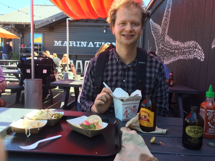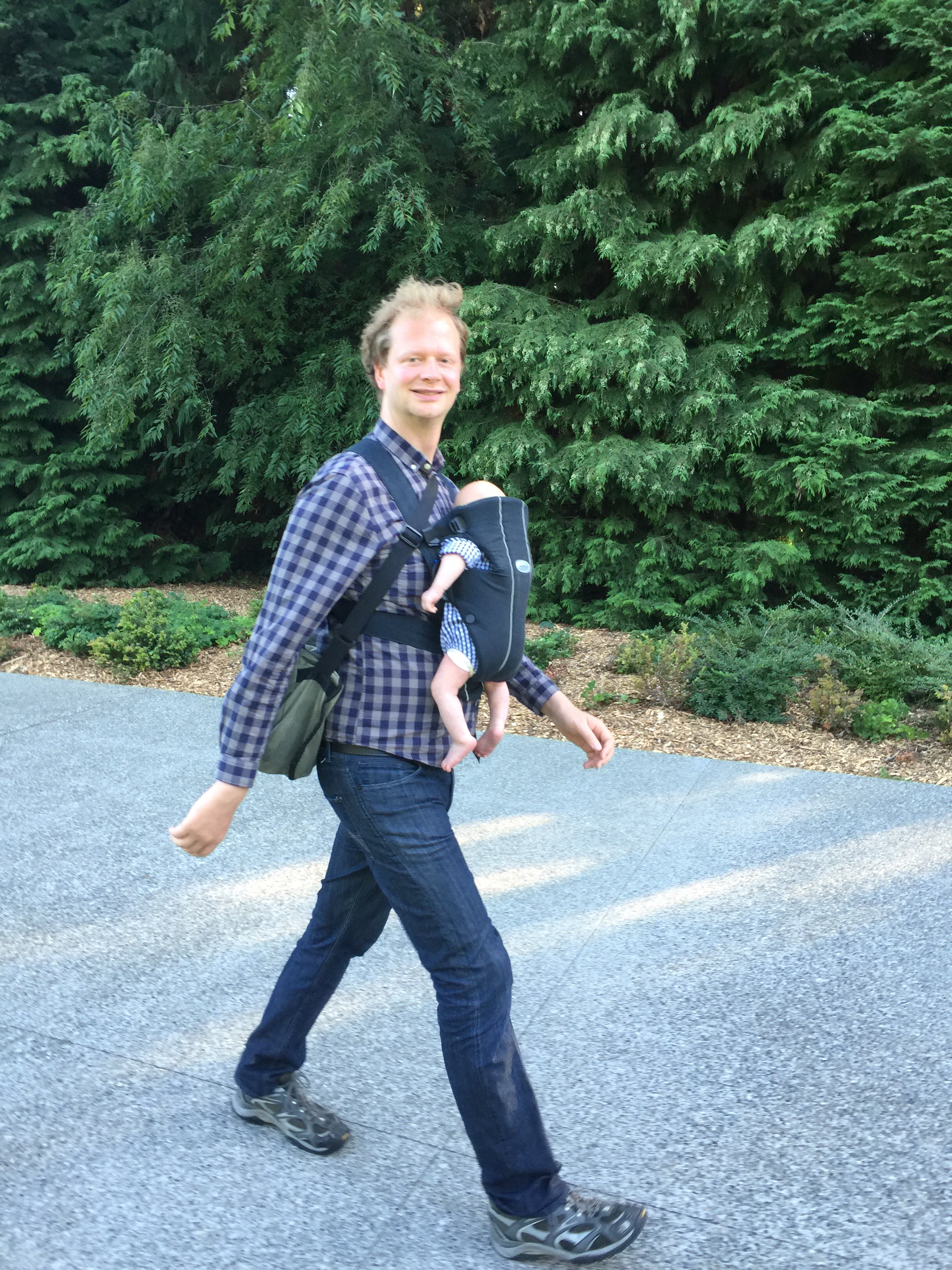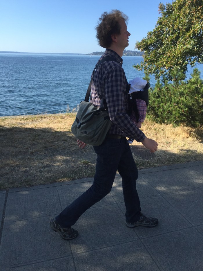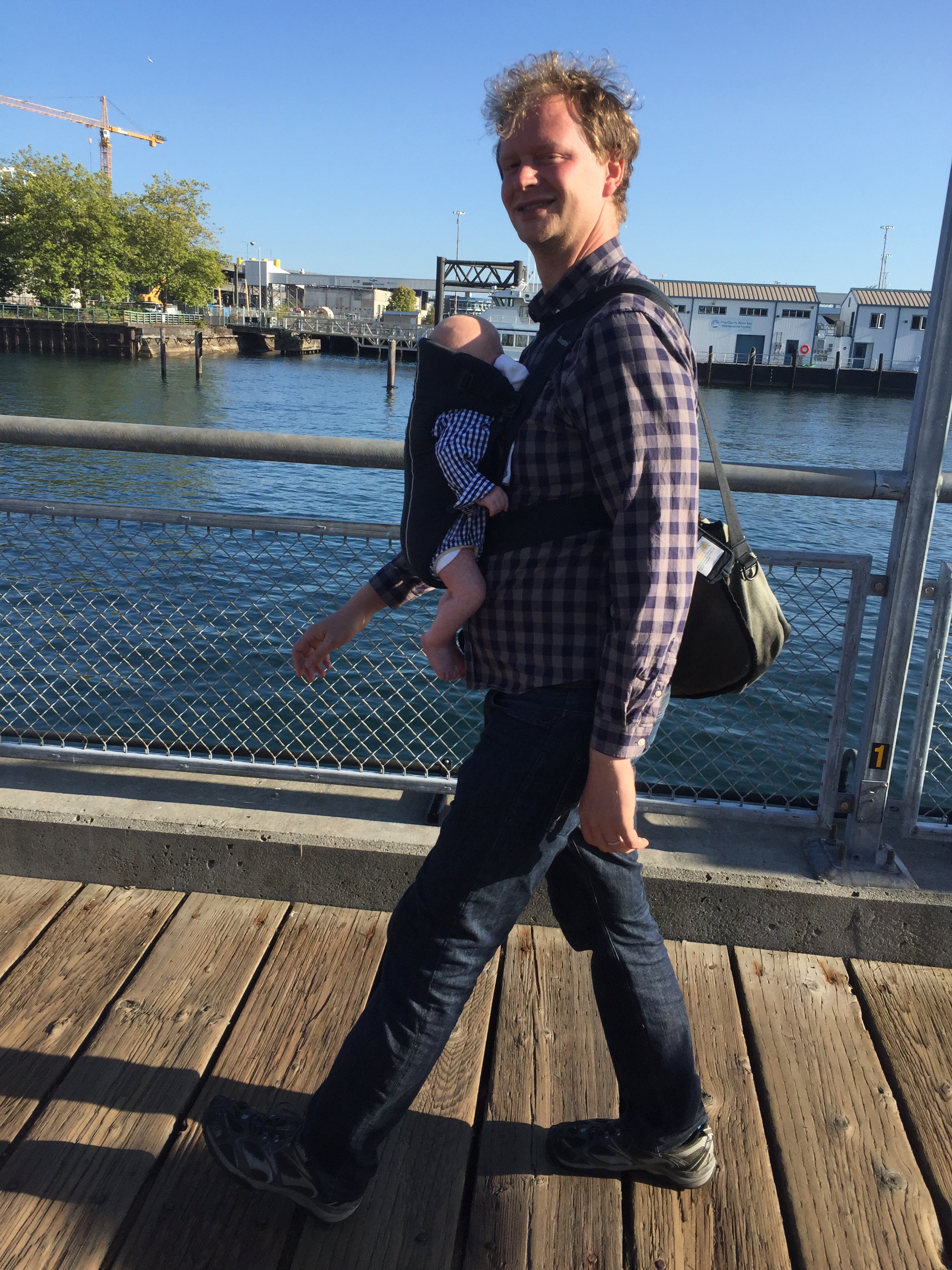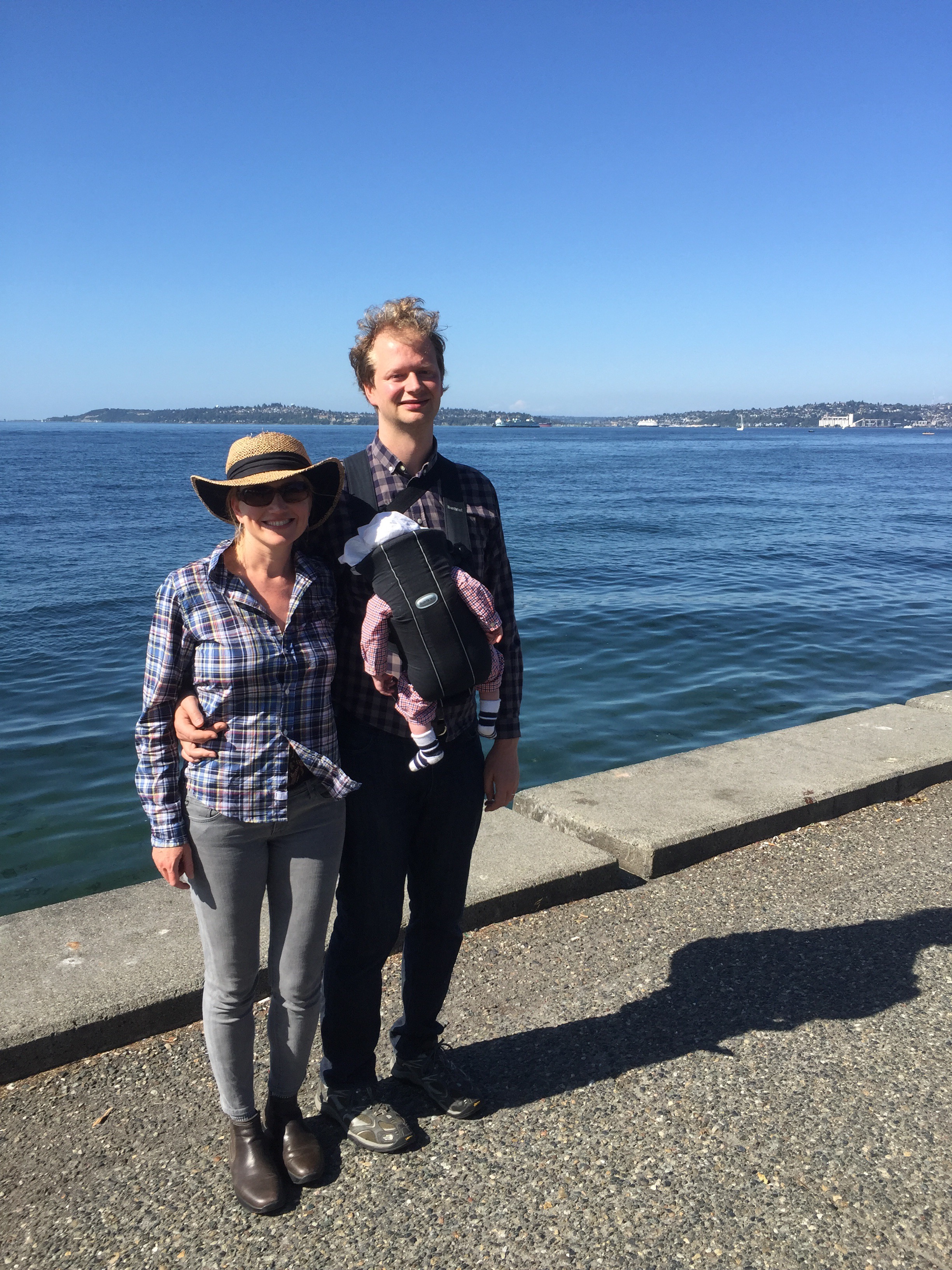We had a quintessentially Seattle summer sunny Sunday. We walked to the University of Washington Link light rail station, rode the light rail to Pioneer Square station, walked around PIO for a while enjoying the scene and the heaps of Sounders fans, took the water taxi to Alki, ate at Marination, walked the Alki waterfront boulevard, watched some beach volleyball and returned home by reversing the journey. Add a Baby Björn, a Cedars Indian takeaway dinner at home with friends, some coordinating plaids, and eight miles on foot, and you’ve got our day covered.