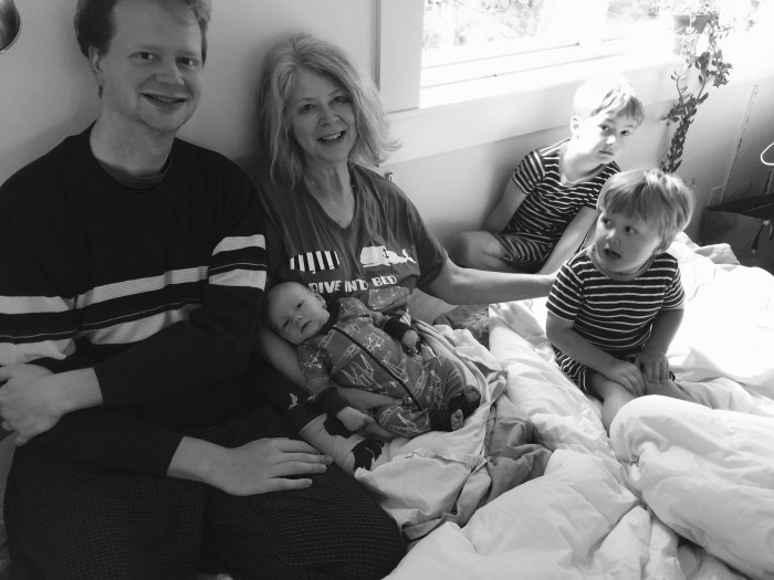 Our little “All American!” We are trying to raise him as a sensitive ecologically minded global citizen. In spite of our penchant for complaining about the various American foibles, we do enjoy our freedom here in this utopian part of the country. Grandma Julie, meanwhile, from the comfort of her cozy home and Bainbridge bed enjoys all her boys gathered around her to the fullest!