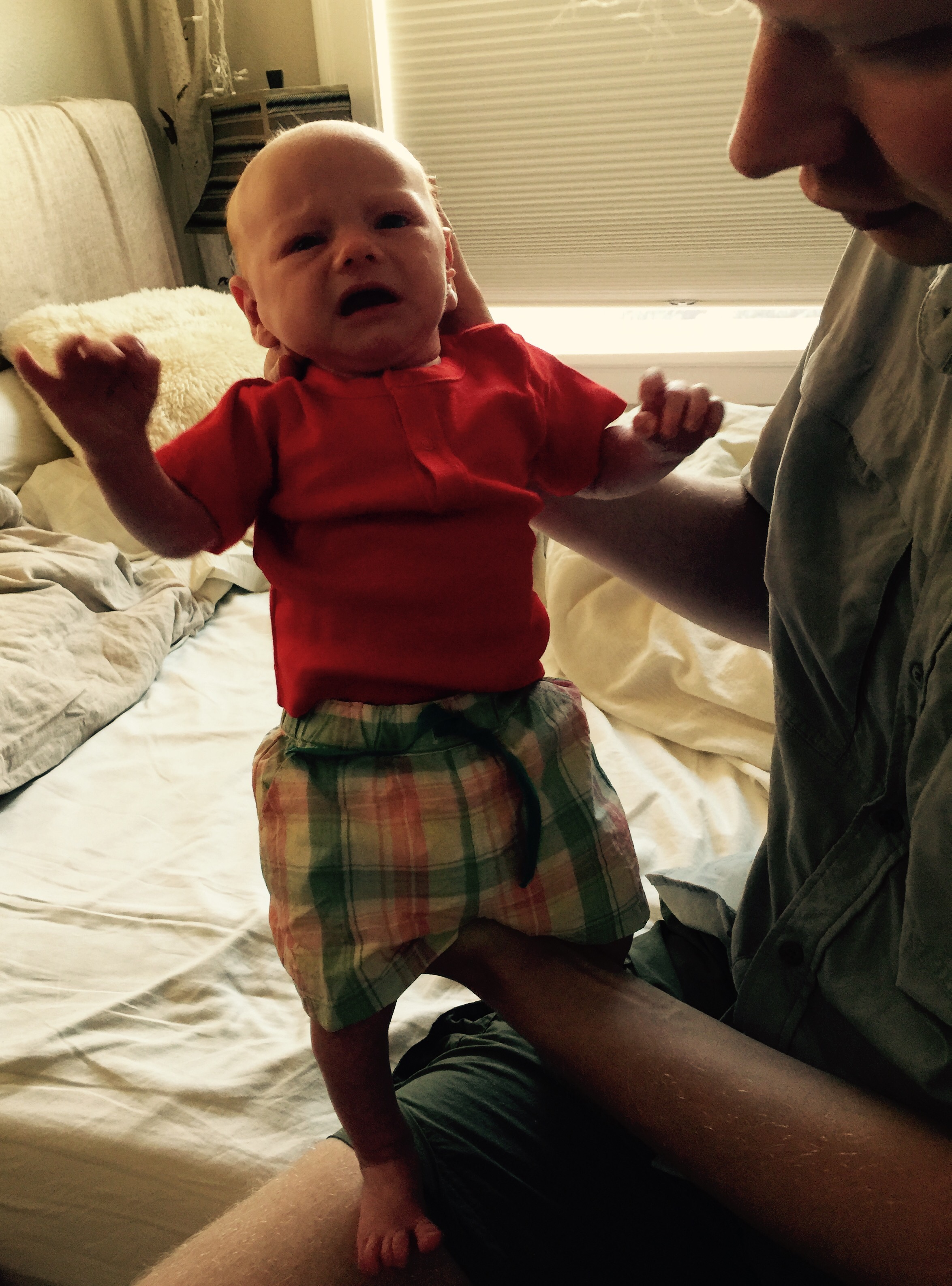 Stage 1: Moderate fussing, wants something but not asking too hard. Gives way to concerned moaning up to grunting, hyperventilating, squawking and starfishing. Generally tolerable to the parental psyche but foreboding. Comes and goes as he builds up a good head.
