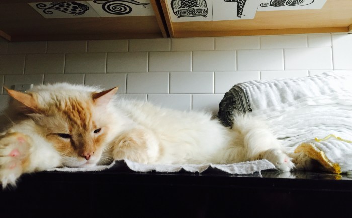 New discovery: Mr. Cat also doesn’t prefer the TJ’s eggplant hummus: too much eggplant, not enough hummus! Yet another reason it’s my new favorite hummus variety (although it can’t hold a candle to Cafe Turko’s hummus); it gives me a bit of reprieve from trying to fend him off while breastfeeding and trying to eat lunch. All in all he’s a solid cat friend: a keeper.