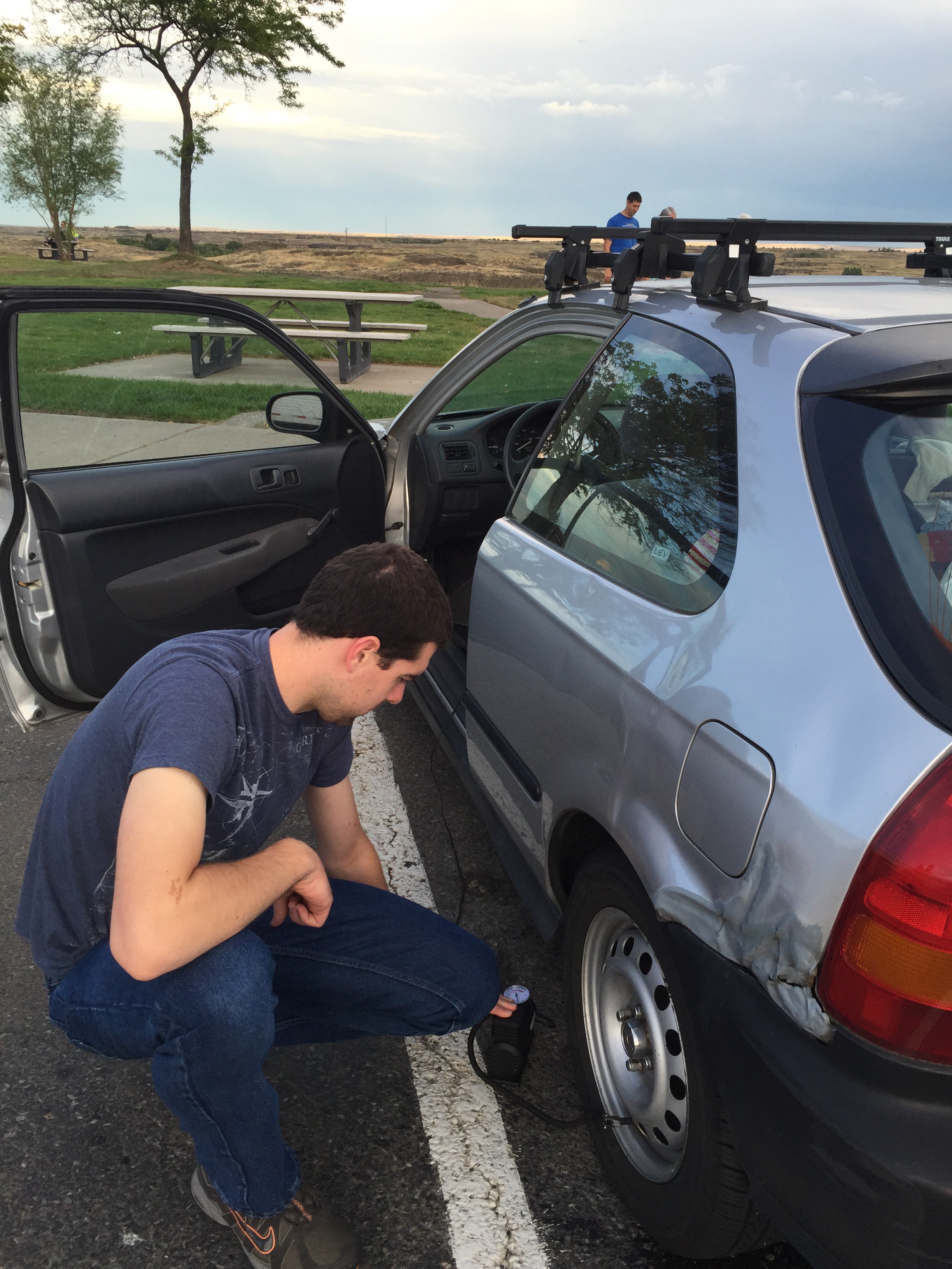He produces a small electric tire pump from his wife’s roadside emergency kit. He exclaims it was at 10 psi (full is 45 psi), and pumps it up to 50 psi, then tells me he thinks I’ll probably make it to Spokane but to