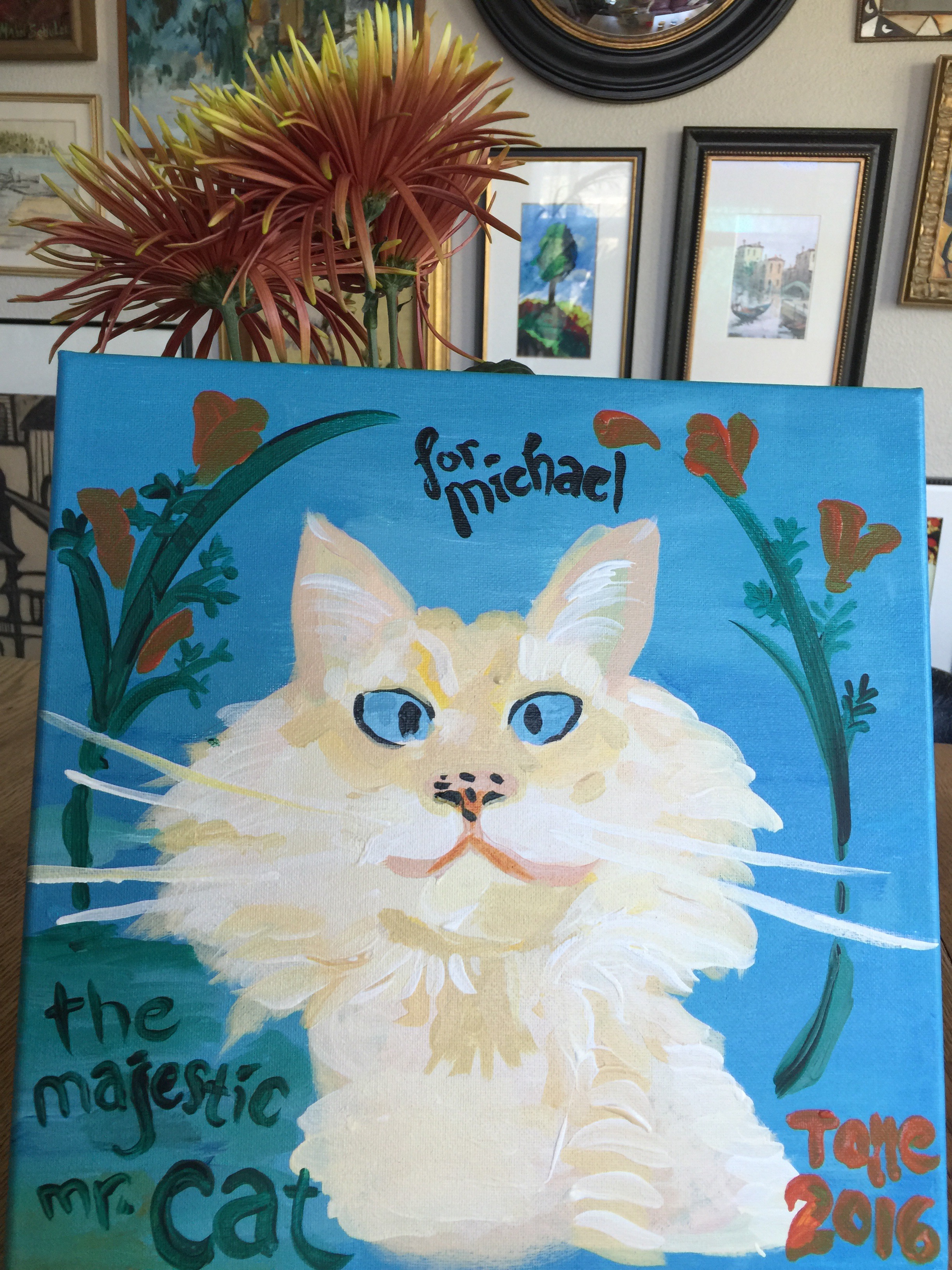 Michael loved his birthday present! On his birthday Saturday we had the great unveiling of my Bad Art painting. It’s a custom piece commemorating his feline pride and joy: The Majestic Mr. Cat!