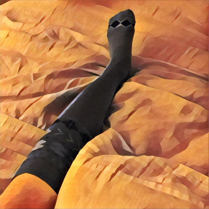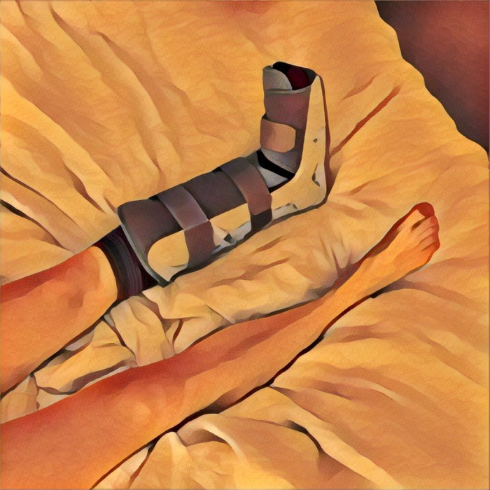Enter the boot. Wearing a night splint is part of my plantar fasciitis treatment. Our bodies heal a lot at night and I want my foot to be in dorsiflexion during this time for optimal healing in a more lengthened position. This way I’m not reinjuring the fascia every morning immediately when I step down because the fascia has repaired too short. So it helps a ton. I am grateful towards my mother-in-law for having “this old thing” on hand from healing a fractured fibula or some such lower extremity bone part. However, “this old thing” splint is actually an inflation boot cast which is huge and plasticky and comes up to my knee. This really helps my foot pain if I wear it at night to sleep. But it really doesn’t help my sexy factor.