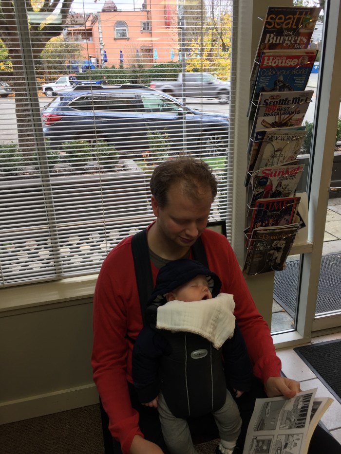 Tuesday night (Wednesday morning actually) was terrible. From 3am to 8am he was crying shrilly and inconsolably. The only thing that comforted him was to keep him on the breast. He ate from 3-4:30 am but then he didn’t go back to sleep the way he normally will if he gets up in the middle of the night, which is in and of itself rare. So then Michael and I were up with him the rest of the night.