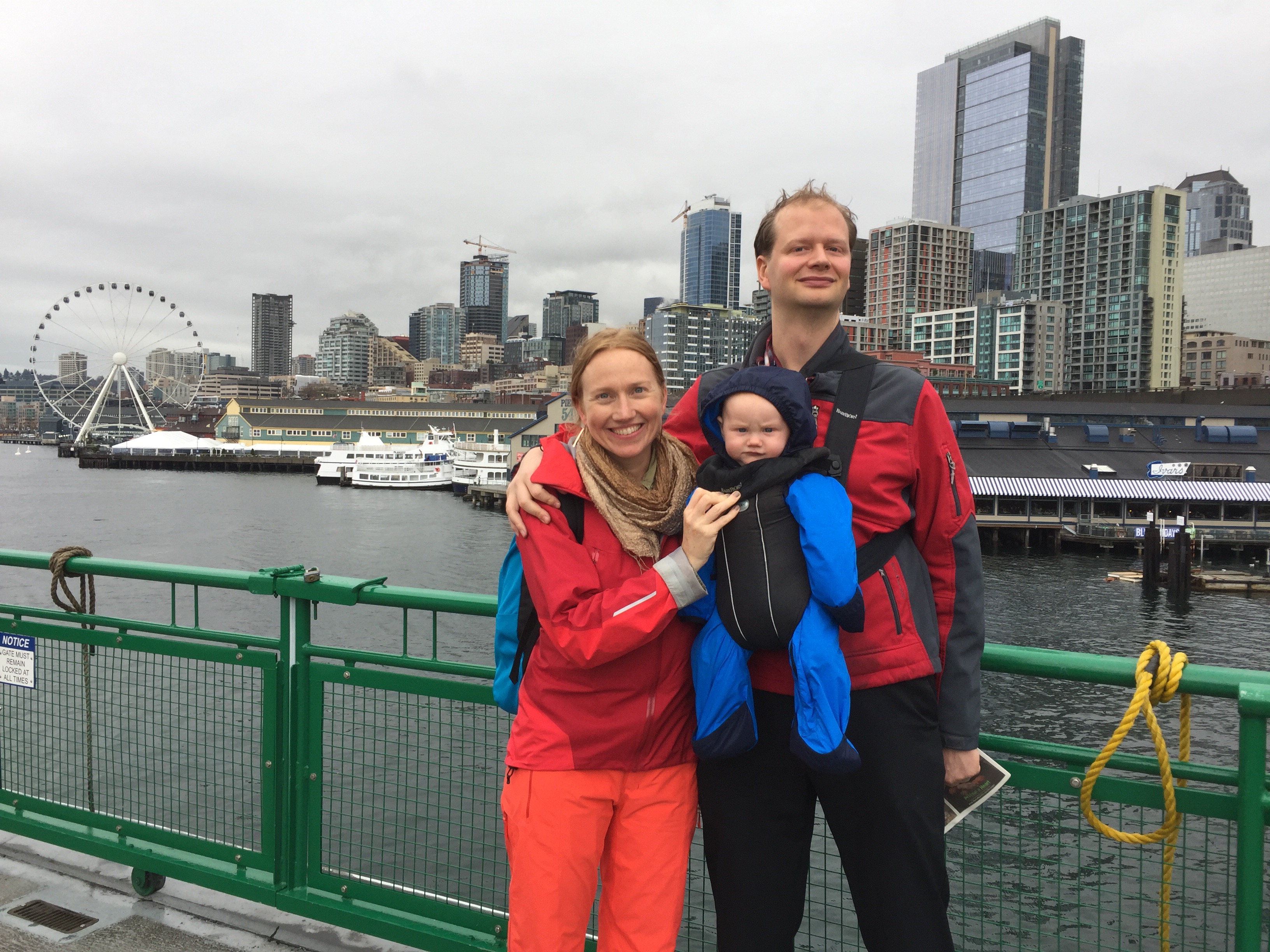 Lake loves a ferry ride! He’s a true Washingtonian. He’s a regular frequenter of the Washington State ferry system by now. Yesterday we look the bus then the light rail downtown to the ferry terminal. It was raining a deluge as we left our building so at the last minute, inspired by Lake’s rain suit, I ran back inside for my snow pants. I was so glad I did. I ended up being so cozy in the wind and the rain, we were able to go up on deck. Here we are reveling in the Seattle skyline from the Bainbridge Island ferry.