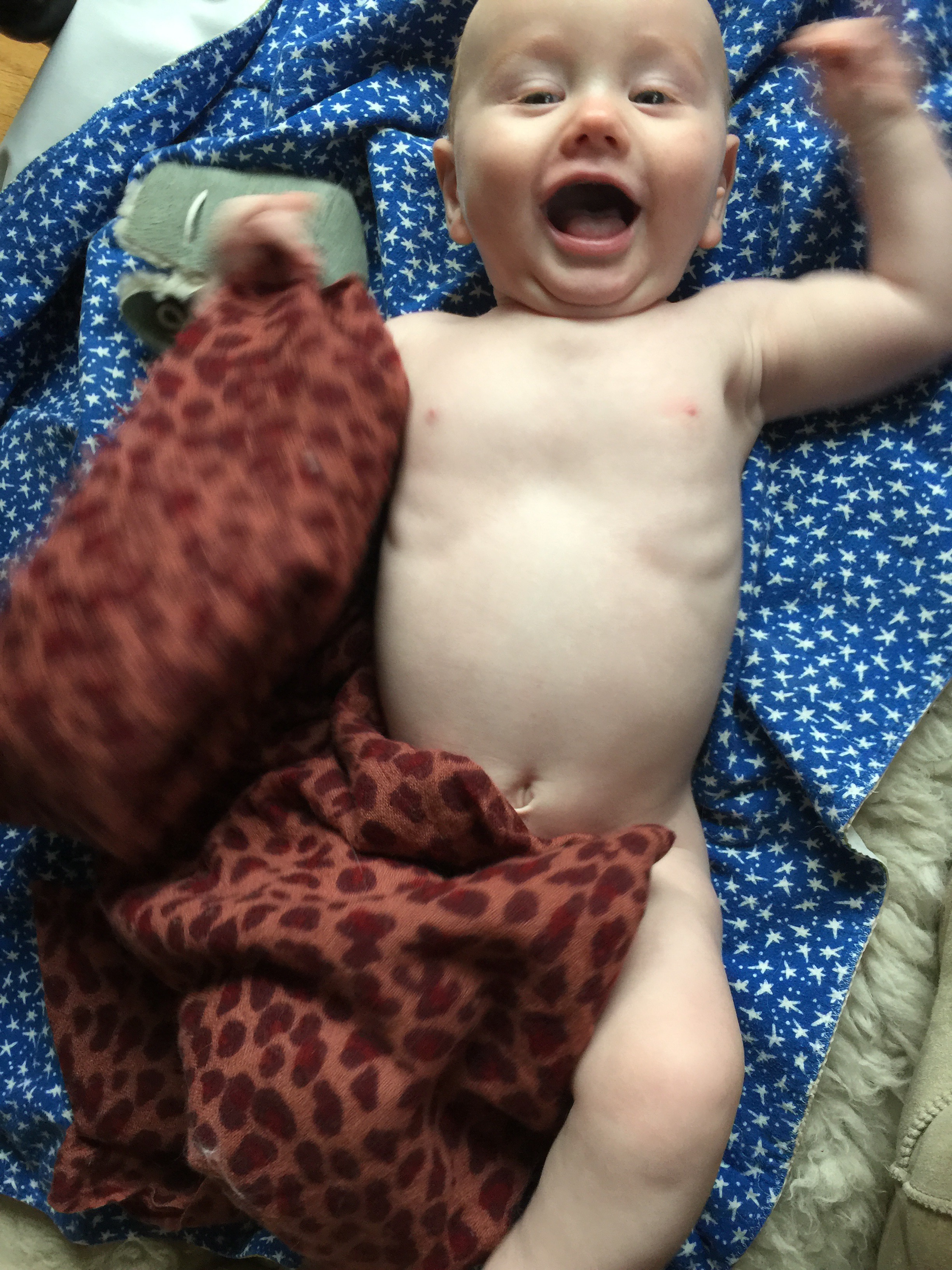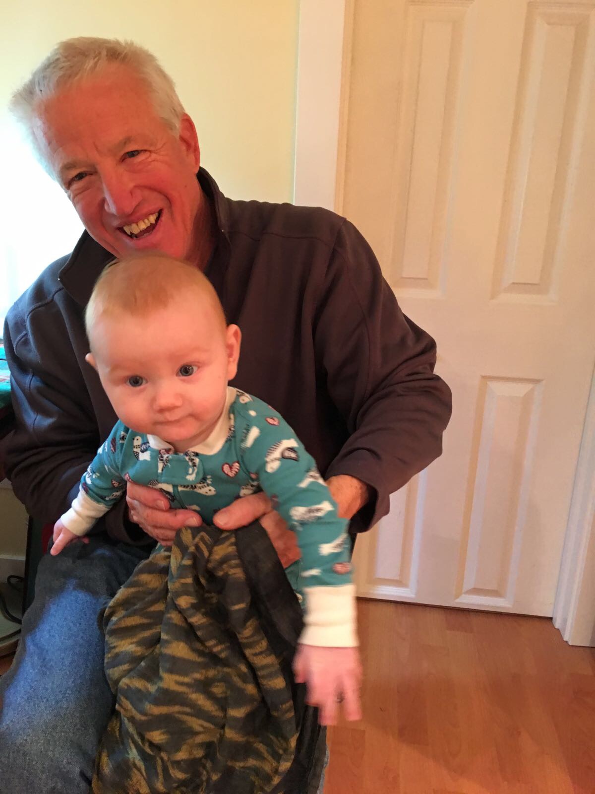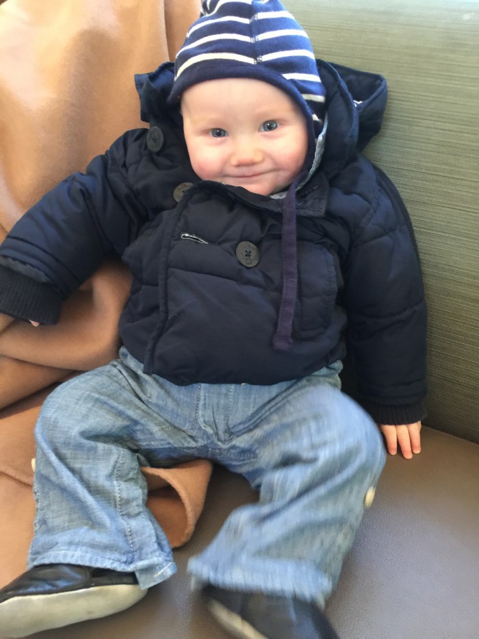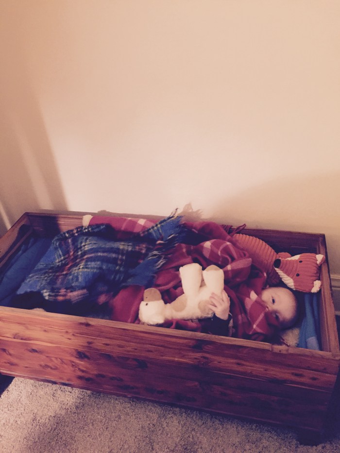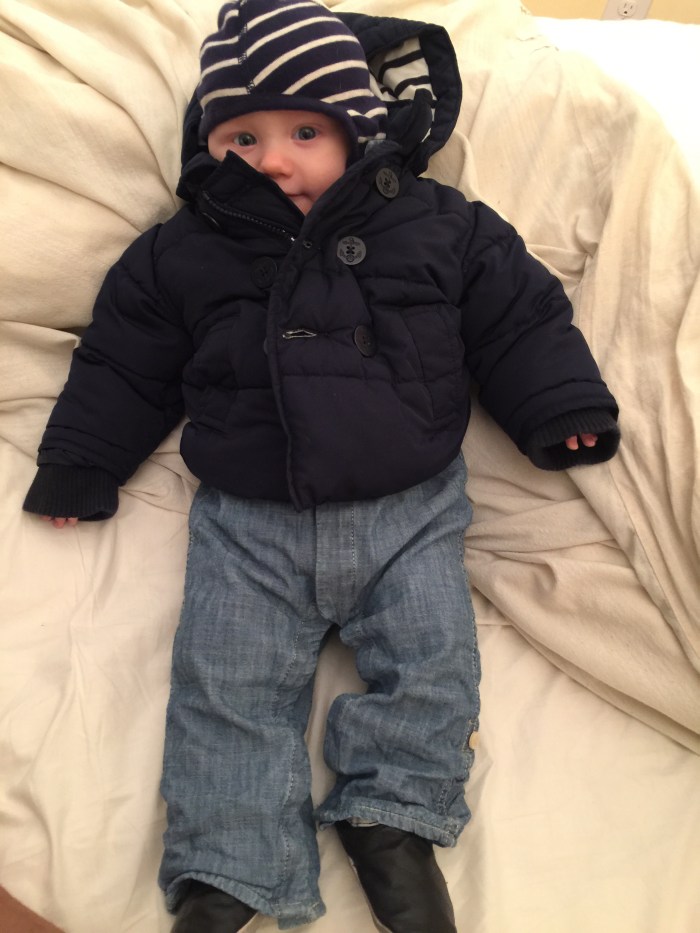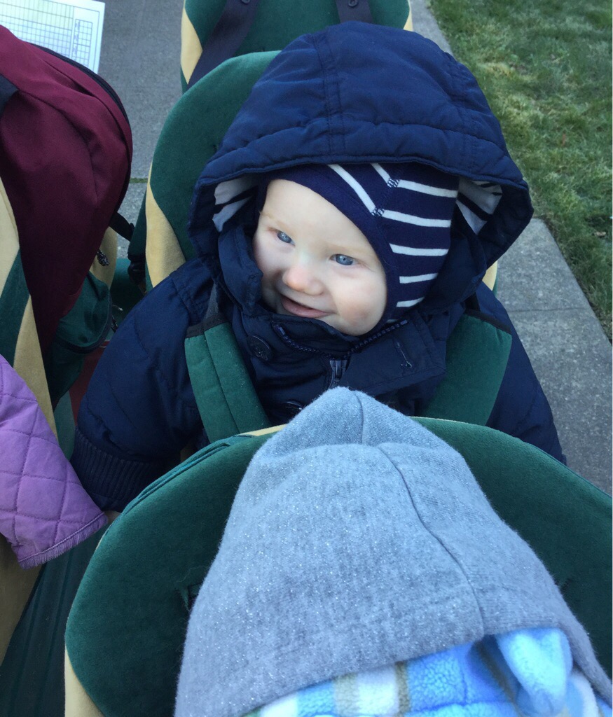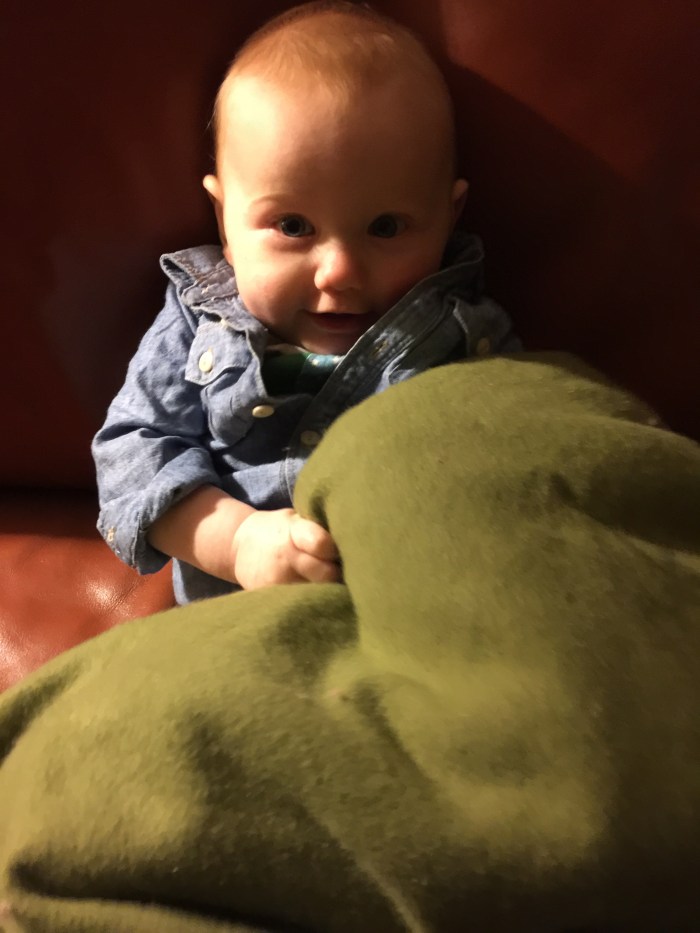 Lake prefers to sleep just barely peeking out from under his blankets with his animal guardians on standby. He pulls the cozy mass of woolly blankets up to, and sometimes over, his head. At Bright Horizons, per government regulations, there is nothing allowed in the napping cribs besides a pacifier, which Lake doesn’t use, so he turns over onto his tummy to cozy his face into the jersey sheet. At home, however, where he is free to choose his own path, he really piles it on. This is my daily delightful Good Morning picture: