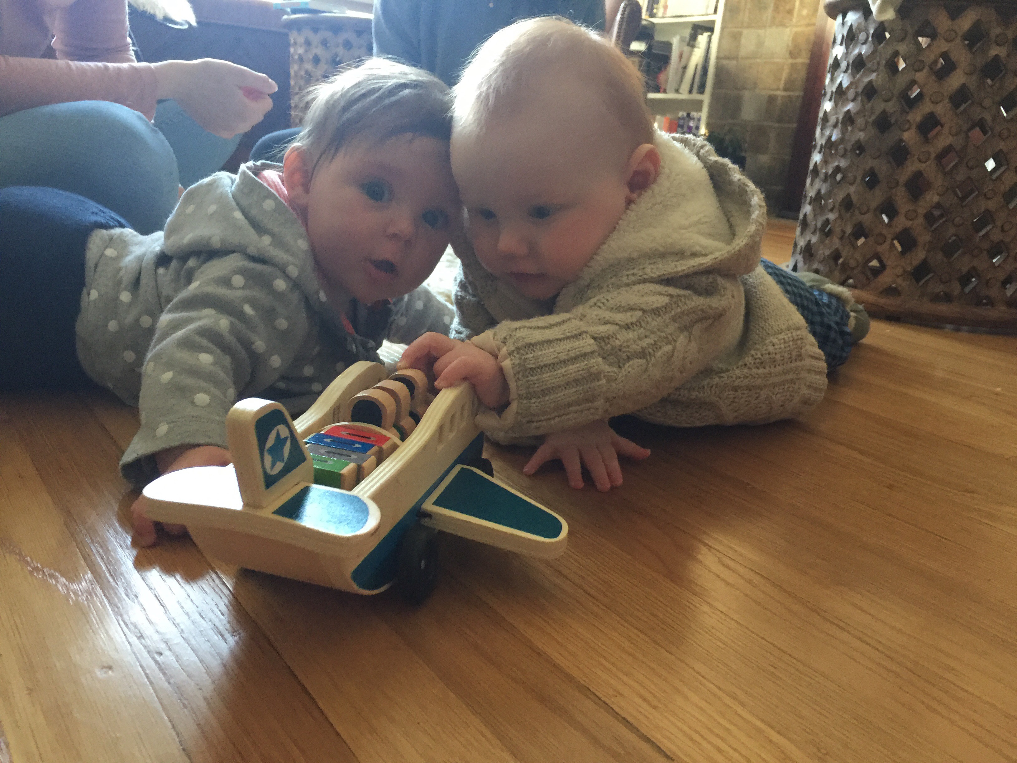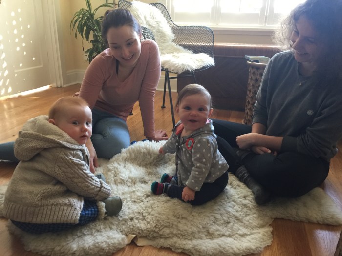 We are über super fortunate as it turns out… Not only do we have Jo, but Jo has another au pair friend from Germany living just four blocks from us. And this au pair, her name is Rafaela, is taking care of another baby even. Her baby girl is just two months younger than Lake. Rafaela is a lot of fun and she and Jo get along really well. And the babies are thus also getting acquainted. It’s really cute! Today they got together as they often do to take the babies out for a walk in the fresh air. Sometimes they meet up at Greenlake. First they played a bit here at home before walking to the University Village. So I finally got to meet Rafaela and Piper. So sweet! We had a good visit. Come again, neighbors! We are so happy to be friends.