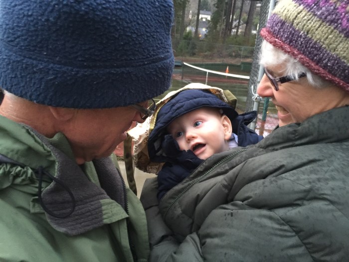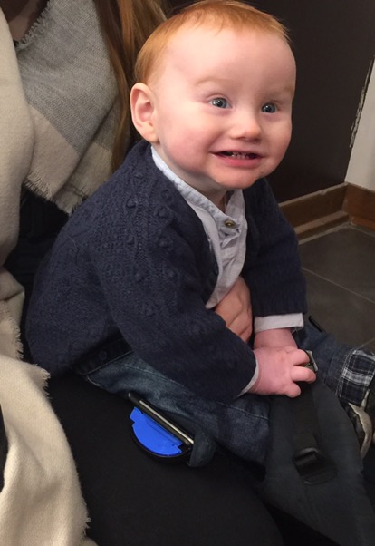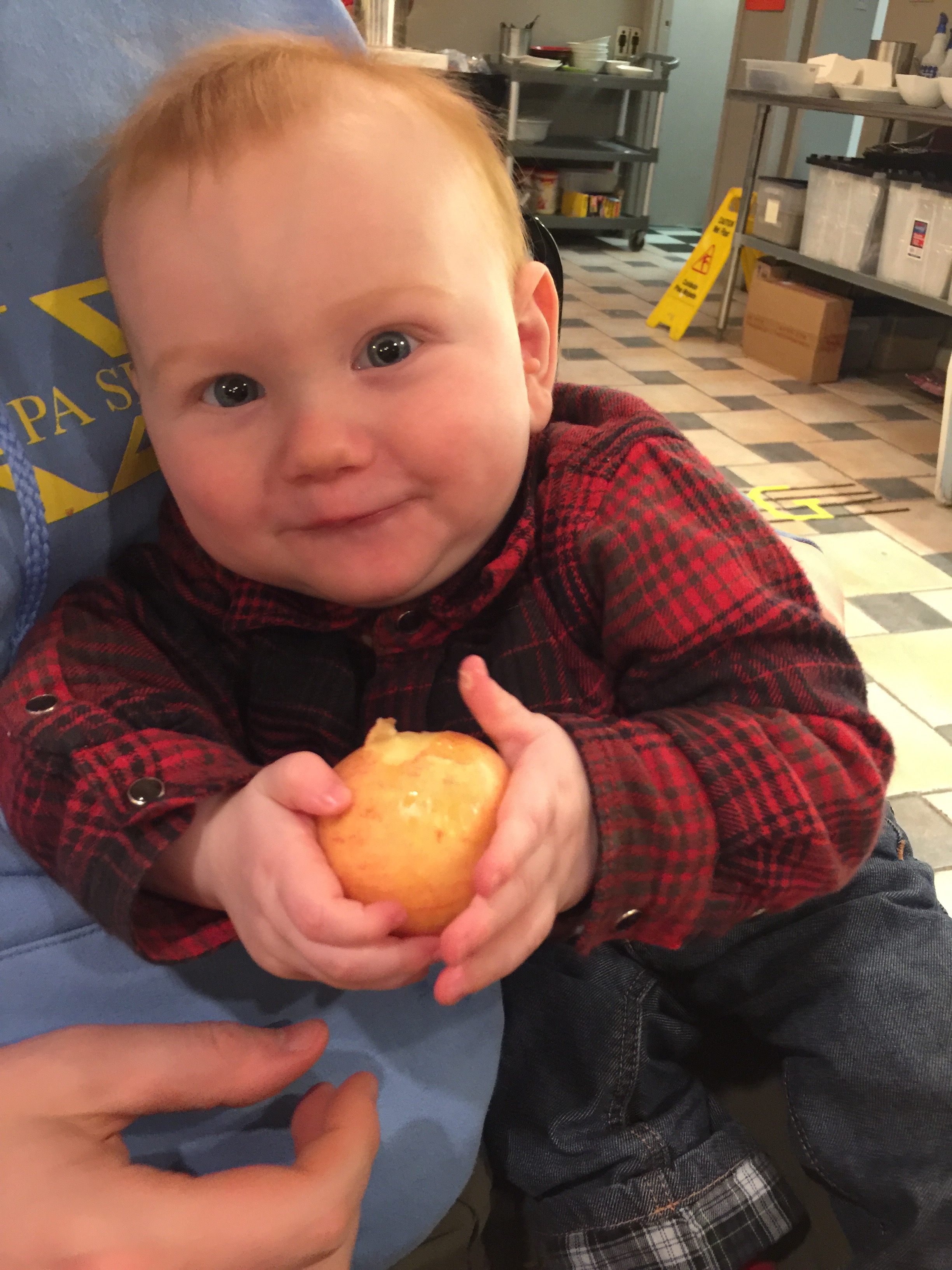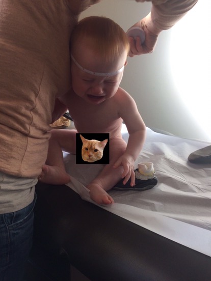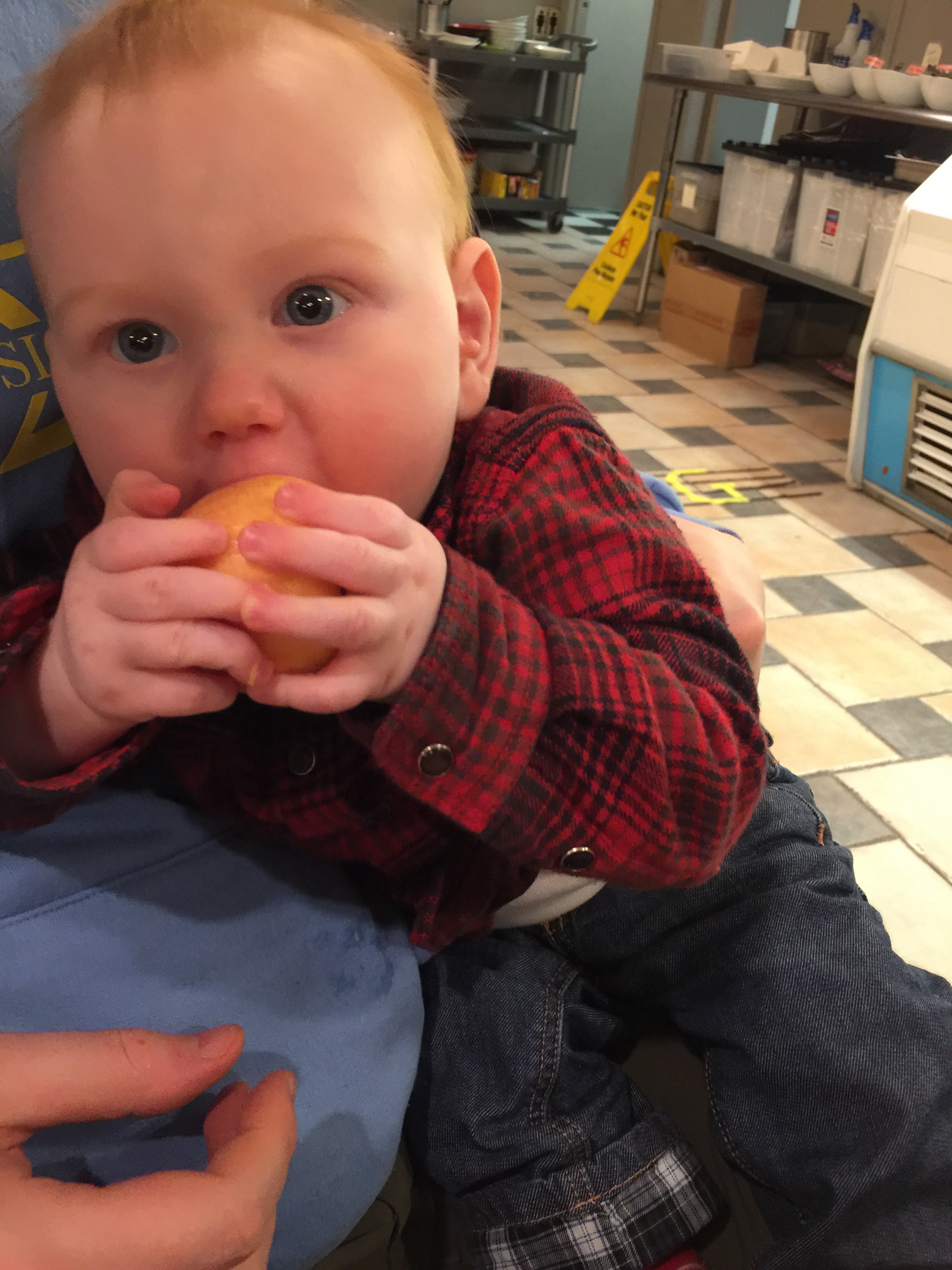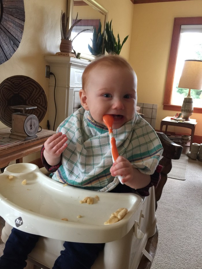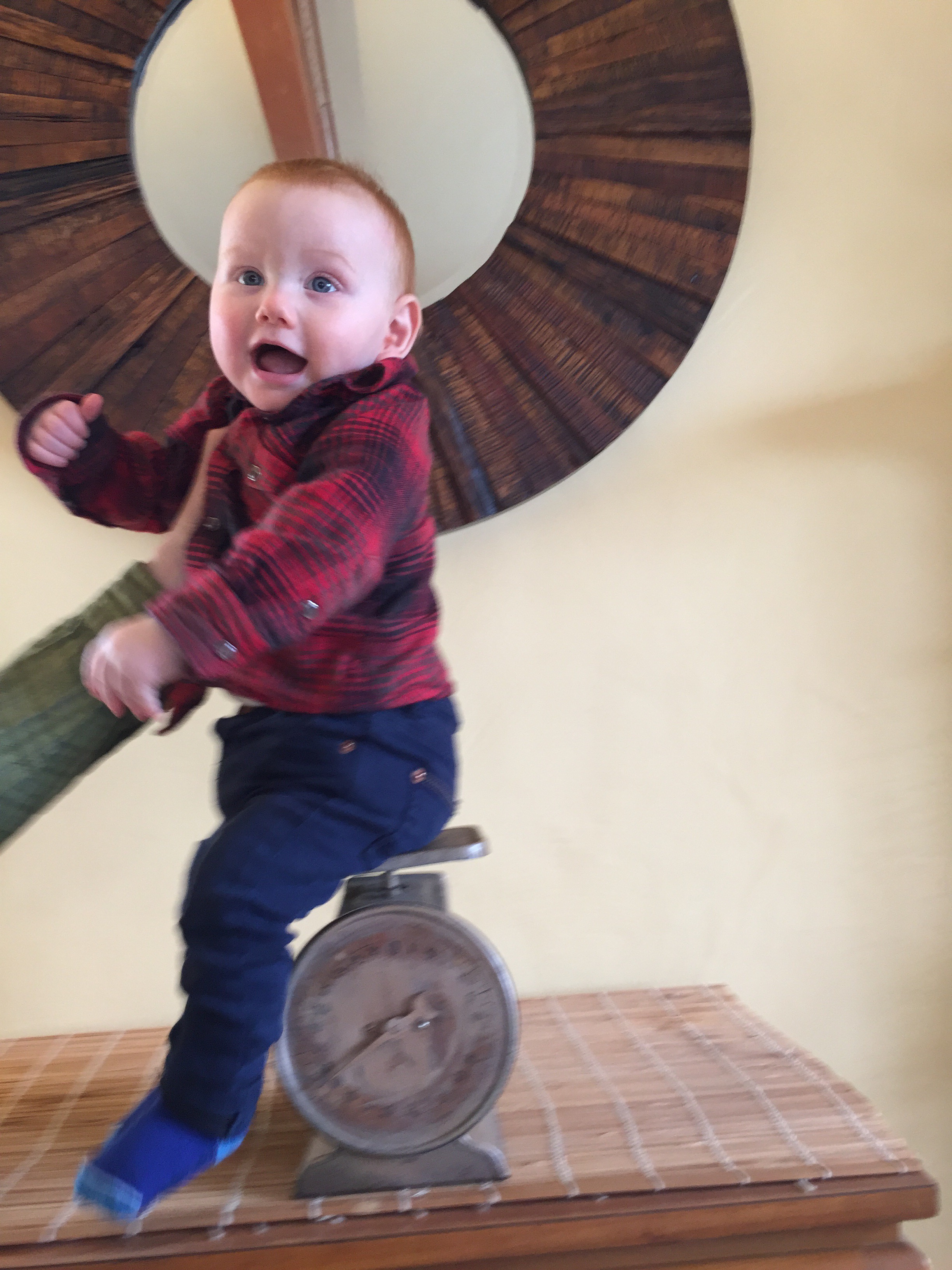 At his 9 month well-child check yesterday he let his doctor really know how he felt about naked head-circumference measurements. He weighed in at 18 pounds, distributed over 21 inches. (I’m also still the same as last weekend 128.8… so far we are tying for “biggest loser” and we are both big winners. ) Anyway, this puts him at 78 and 22 percentile for height and weight respectively. A long and lean baby machine!