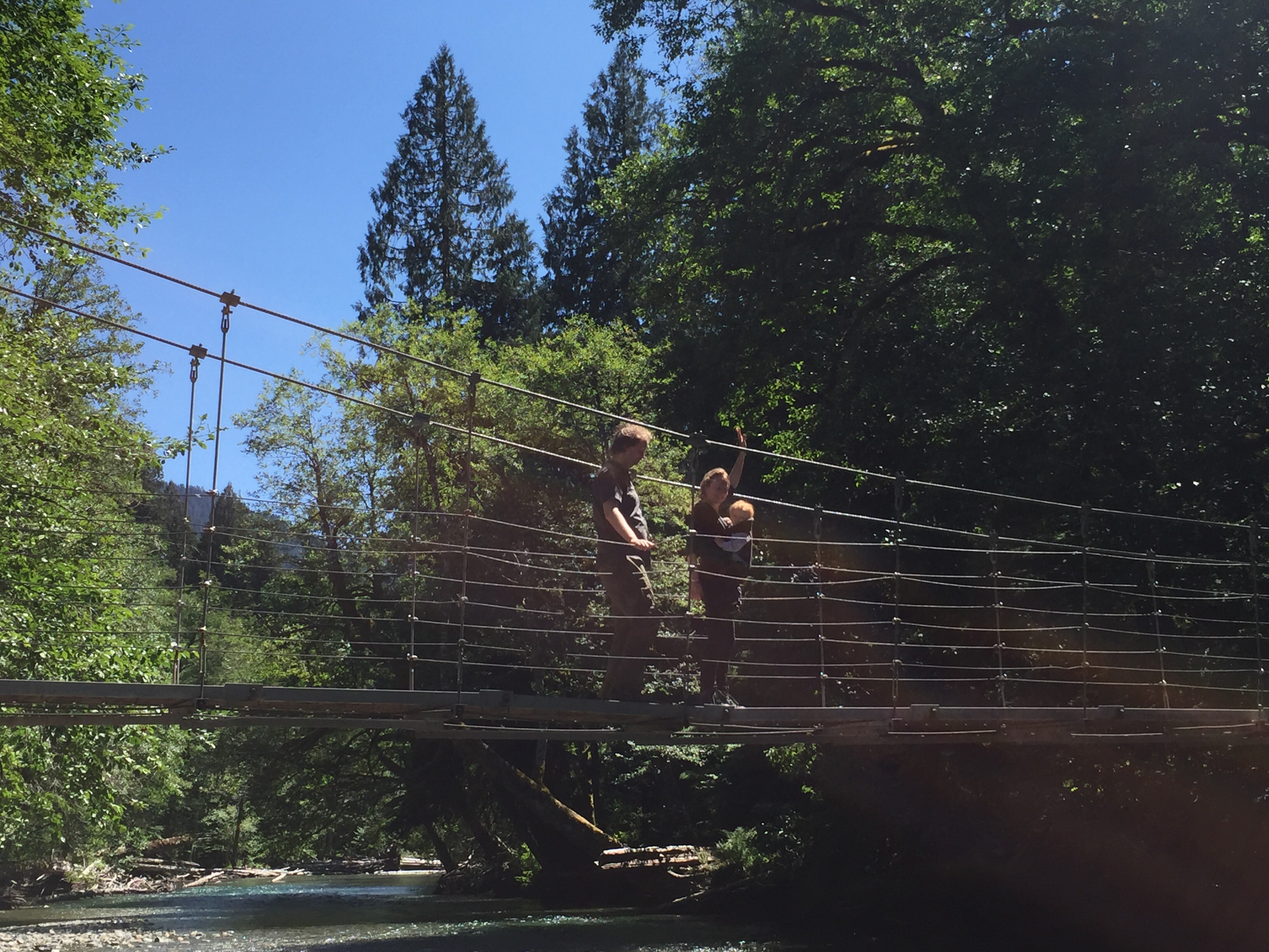 On Sunday, we enjoy a relaxing morning in camp. Hey, we survived our first night out! We easily break Camp and head back into the park. We visit the Ohanapecosh River suspension bridge and have fun lazing about on the riverbar.