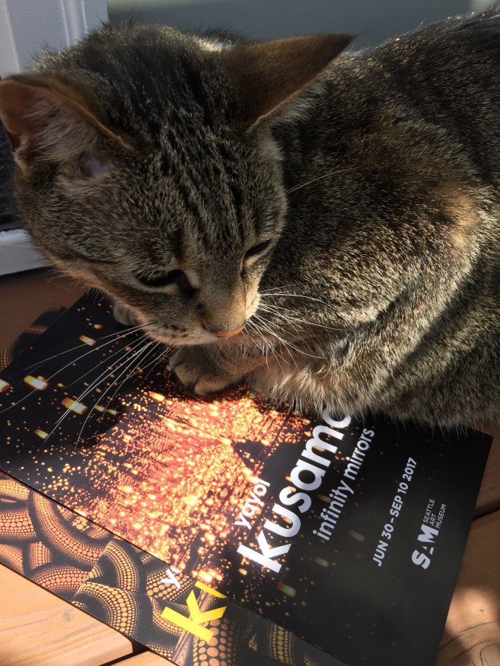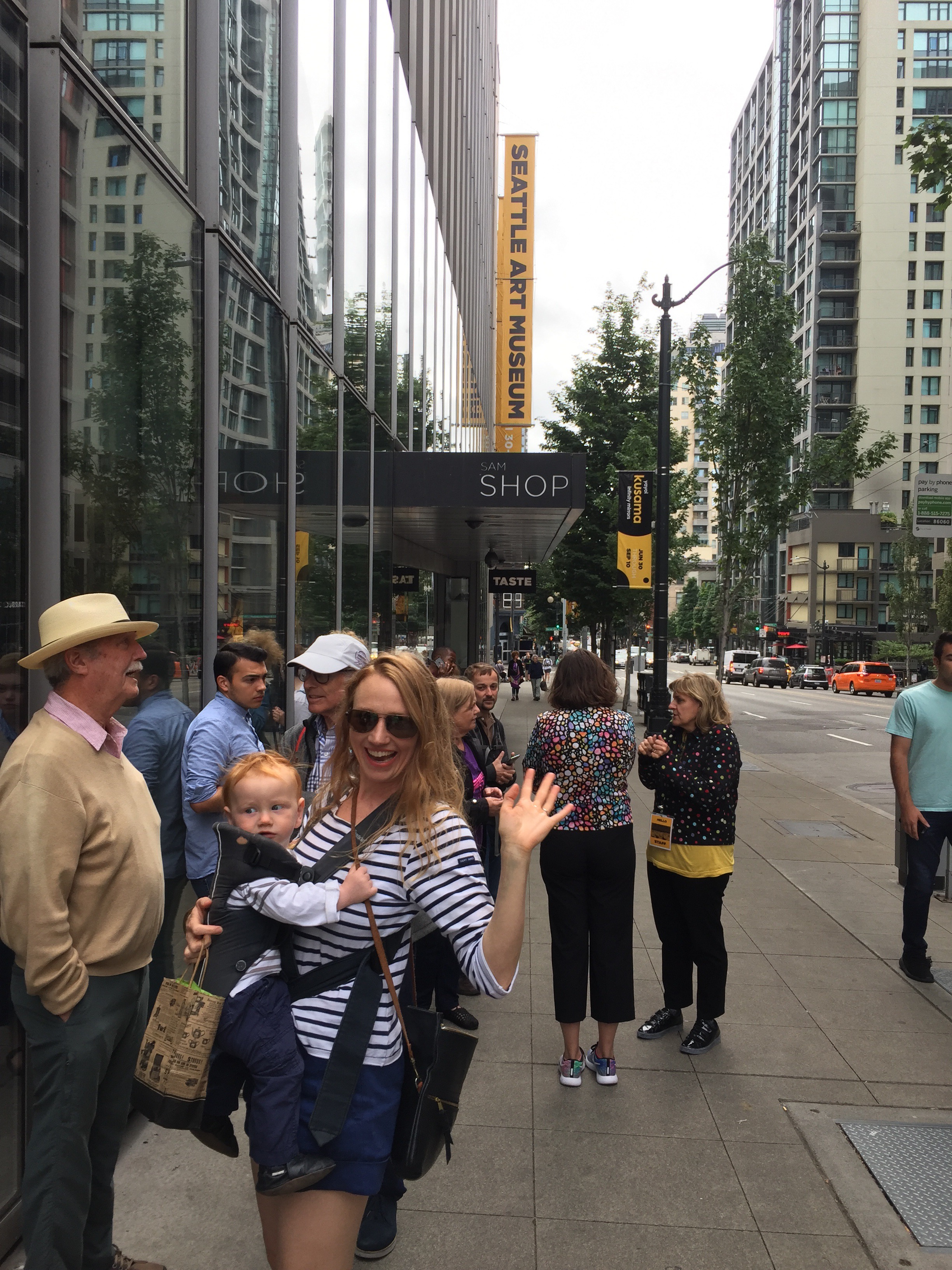Lake made his first foray to the Seattle Art Museum today. Yayoi Kusama’s exhibit was the big draw. We took the Link and arrived right at 9:00 am to wait in line for the day’s admission tickets to be released at 10:00 am. While we were in line we made some friends and were blessed by a Buddhist monk with one leg.