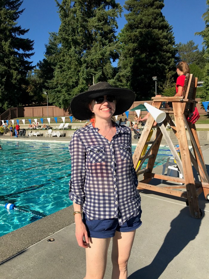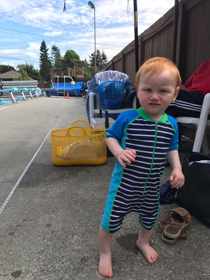Seattle holds so many secrets. Hidden gems in plain sight, or in this case, neighborhood pools. There’s a private pool in the Wedgwood neighborhood east of Dahl Playfield that I stumbled upon one day a number of years ago BK (before kid). As it turns out, it hosts the Wedgwood Swim Club and boasts a waiting list comprised of more than 1000 families. It is the very same pool that my aunt and uncle have belonged to for 35 years. My cousin grew up swimming for this swim club and they spent all their summertime here. This summer they’ve invited Lake to join them for a few swim dates. At first Lake was pretty timid and skeptical, but with each visit he gains some more of his “sea legs”.