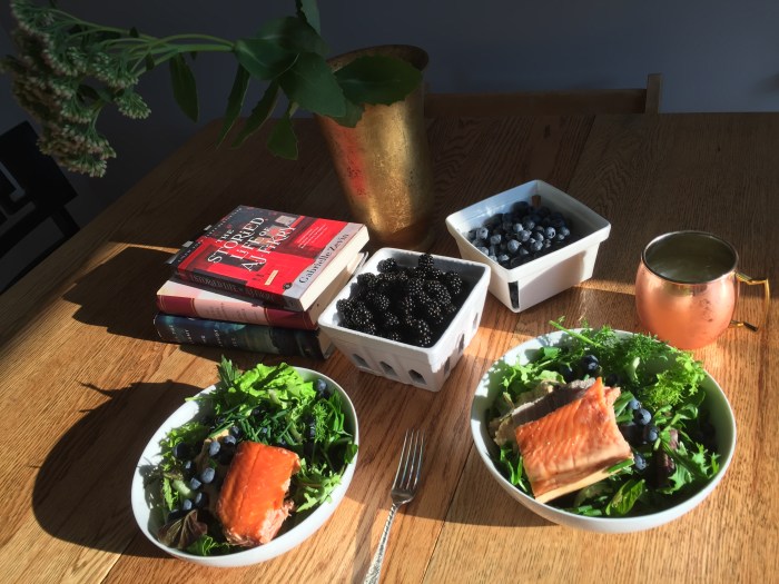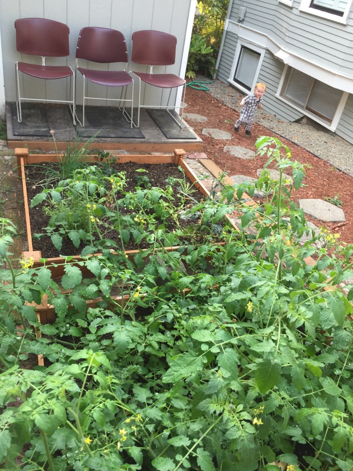 On the way home we visited our favorite bookstore: Ravenna Third Place Books. We spoiled ourselves with new books. We went home via Ravenna Park and when we got home we played in the garden some more. We enjoyed the fruits of our labor, a nice Tolle-dinner of smoked salmon from Westport on a bed of mixed greens from Wild Hare Organic Farm. To cap it off we had fun getting cleaned up and playing in the bath then back out into the garden while FaceTiming Nana. There was even a failed attempt to ride Mr. Cat that ended in a hug-face plant.