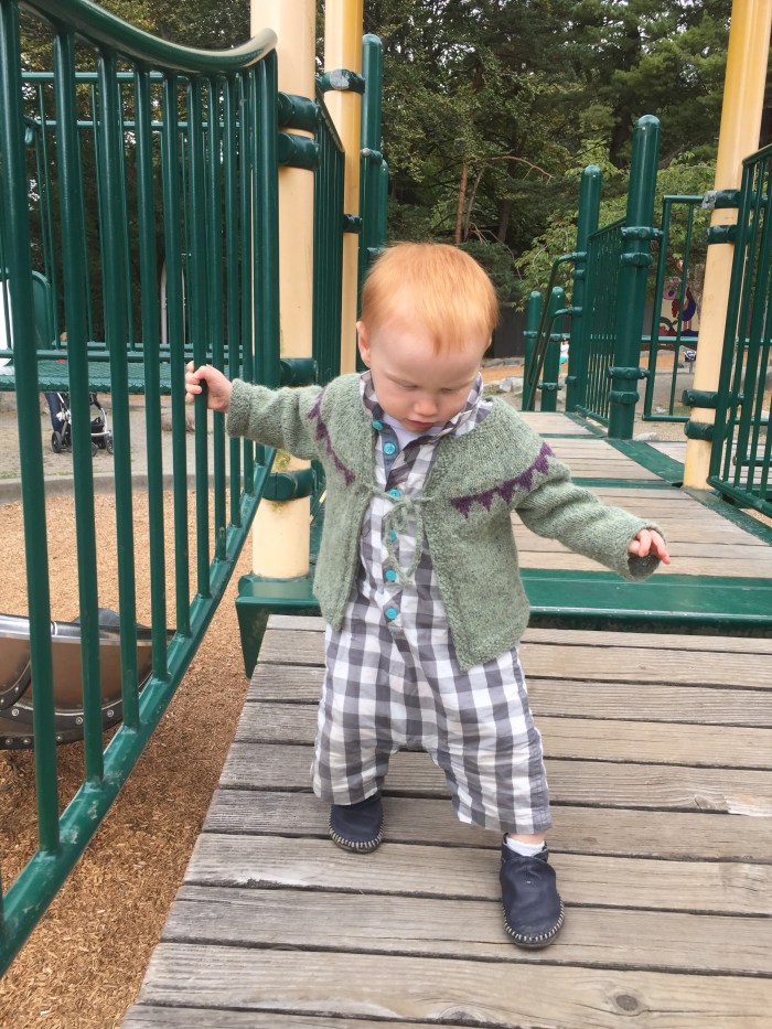 What an autumn day to be playing in the neighborhood park post farmers’ market! When the day brings by turns warm sunshine and sudden downpours, what could be better than a sweater? Lake is outfitted here in a summery cotton romper topped with a cozy wool sweater. The soft sage green cardigan with a jaunty string of aubergine flags was hand knit by Nana Joanie. What a perfect sweater-weather weekend!