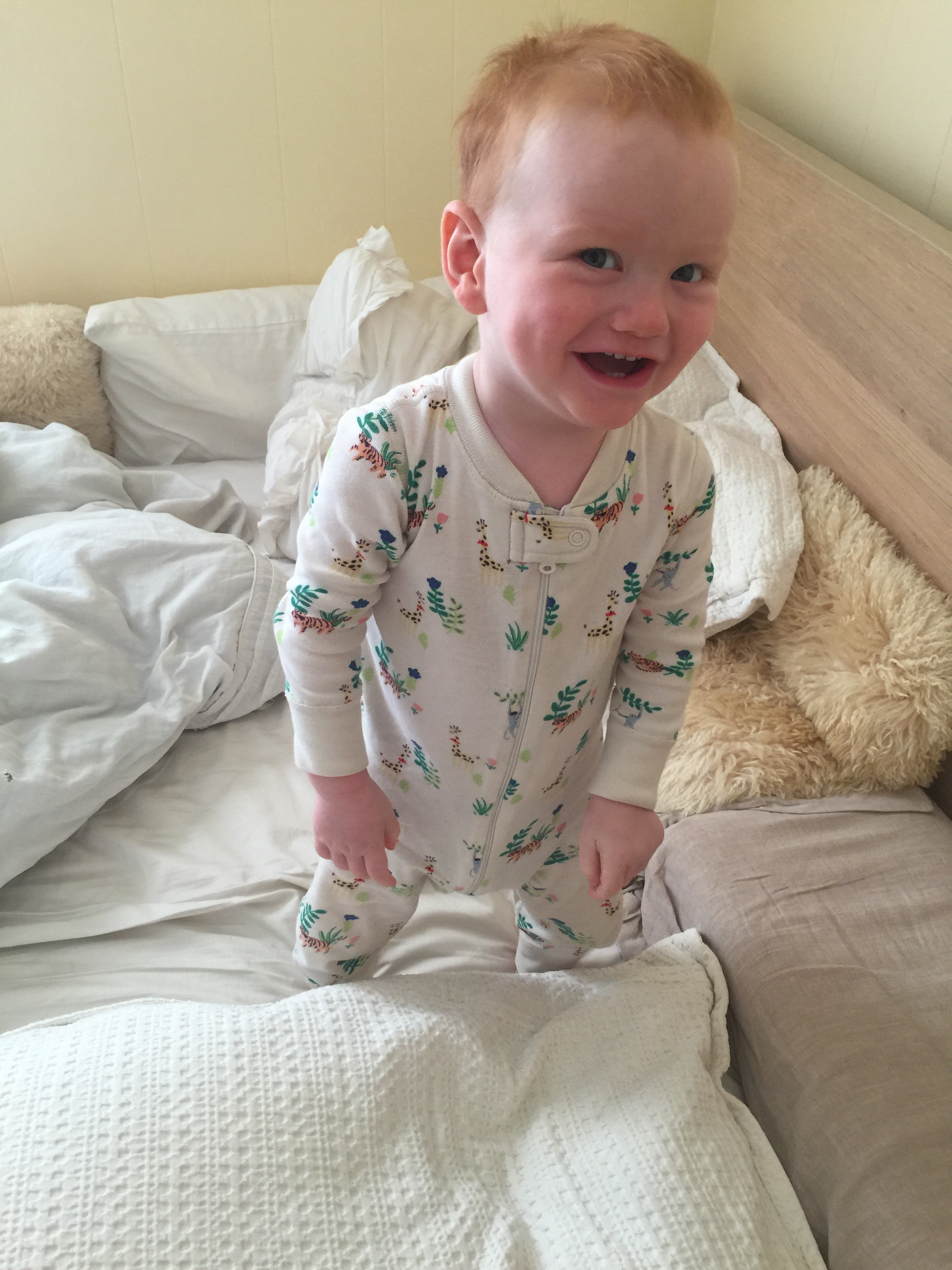 Ich (I want, me-mine), Hi! which sounds more like the Swedish: Hej and Mamammama (reserved for when he’s hungry and/or tired). He can also answer yes/no questions clearly.