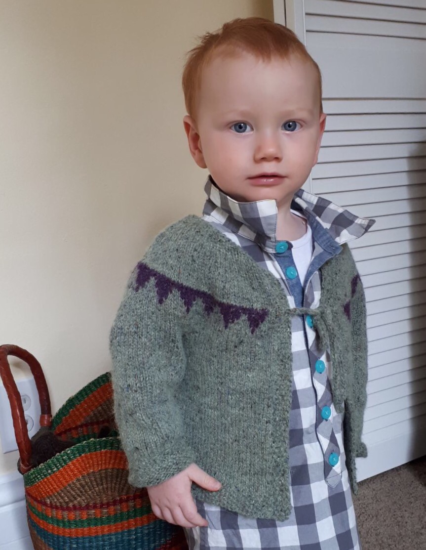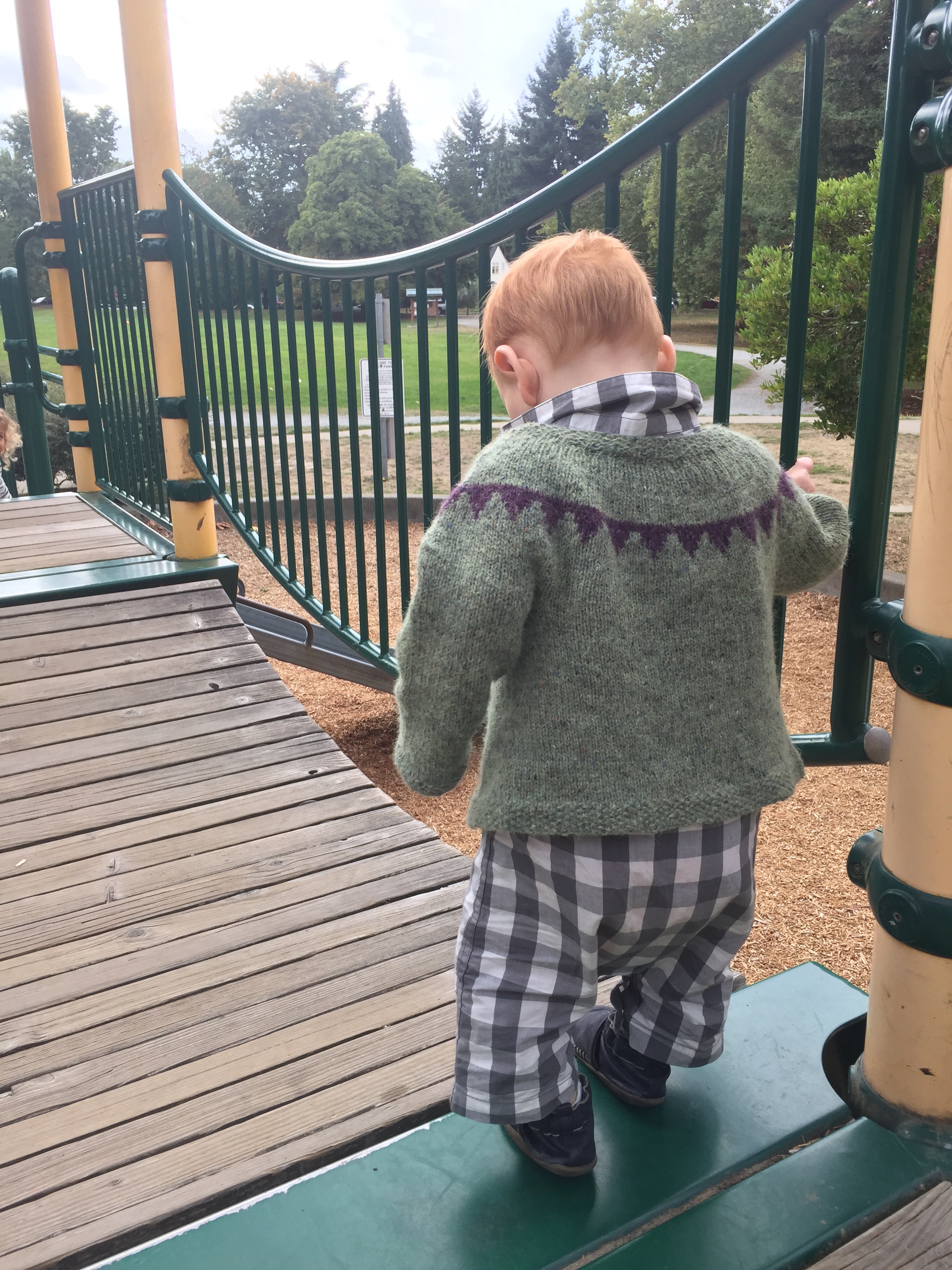 What an autumn day to be playing in the neighborhood park post farmers’ market! When the day brings by turns warm sunshine and sudden downpours, what could be better than a sweater? Lake is outfitted here in a summery cotton romper topped with a cozy wool sweater. The soft sage green cardigan with a jaunty string of aubergine flags was hand knit by Nana Joanie. What a perfect sweater-weather weekend!