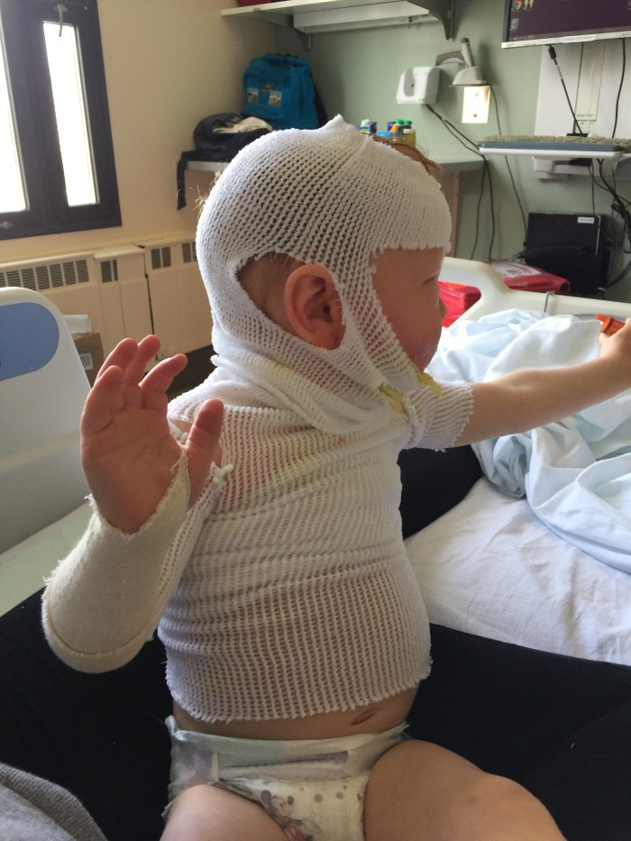 We chose to come home after one night instead of staying another day. We discharged from Harborview at 5:30pm Tuesday. We made it home with Lake in good spirits and soon he was asleep. He still looks like a war survivor with his raw, peeling and oozing face. The big task for us at home is staying on top of wound care. He has sustained a partial thickness burn to 2-3% of his body. It looks more alarming than it reads predominantly because it’s his face that is most impacted and edematous with eyes squished shut. Being so young, however, he is anticipated to heal completely in 10-14 days. There will likely be sensitivity and possibly discoloration to the burned areas that will hopefully resolve with time.