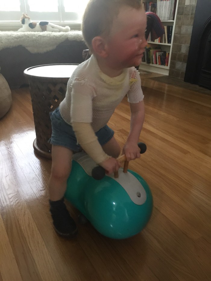 He was with Daddy in the kitchen making tea when the jar of fresh boiled water broke as he excitedly ran over to be near his beloved tea. Boosh! Right into his face. His face and chest and arm, predominantly the right side, caught the brunt of the gush. Daddy got his quickly undressed and into a cool water bath in the sink, then brought him to his sick napping mama for comfort. As I slowly oriented myself I put two and two together when his face was red and he wouldn’t breastfeed. Badly burned. Hospital. Must go now.