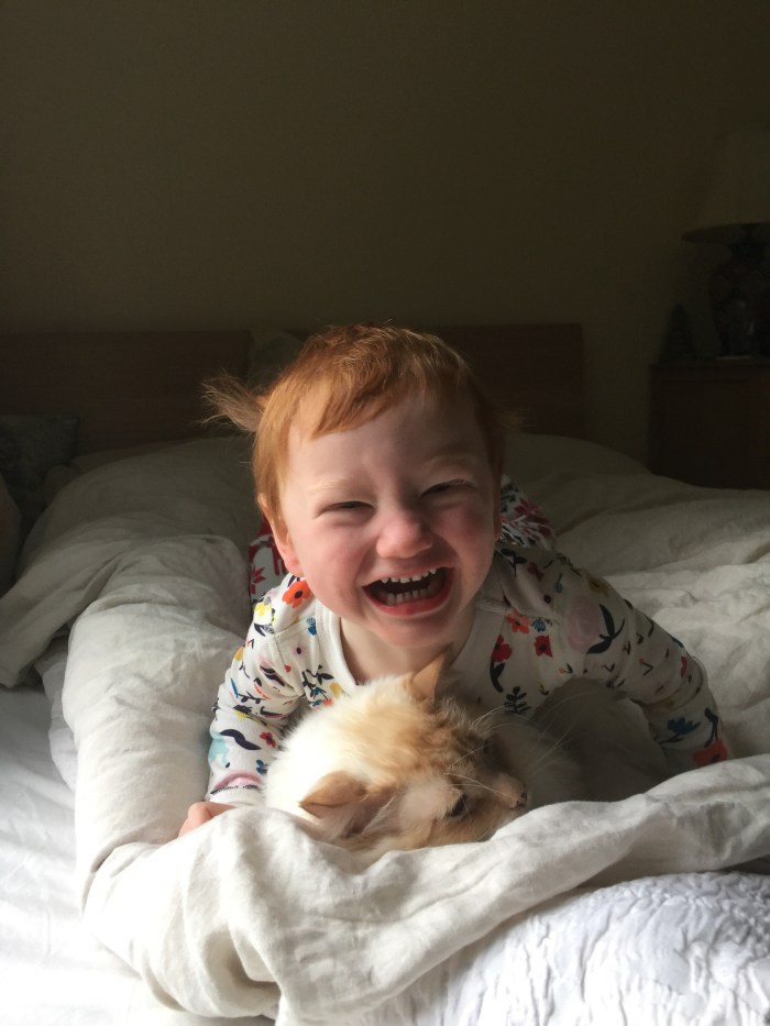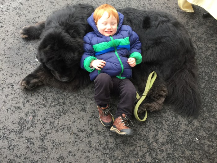 “There’s a Bear sleeping in our house” says Lake. Langley’s 150 pounds to Lake’s 30 pounds… they’re quite a pair. Lake likes to help walk him and likes to hold on to the leash. If you ask him, he will say yes that Langley is his dog. He’s all snuggles and smiles. They both are… unless… when Langley is wet from the rain or just from drinking water, Lake says “Stop it!” when Langley comes near.