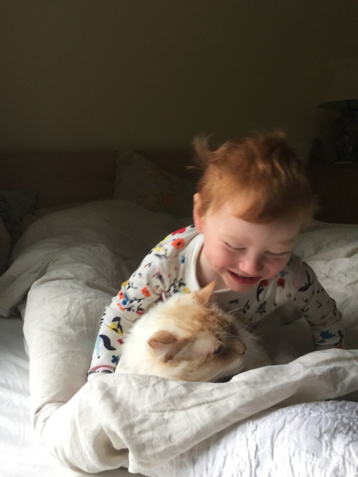 Lake loves his Mr. Cat. He loves to cuddle and play house and jump on him. He really does all this, and somehow Mr. Cat tolerates it all. Mr. Cat is a true friend to Lake, and in return, Lake is very devoted to Mr. Cat. He will cuddle up next to Mr. Cat at every opportunity. He plays “house” with Mr. Cat on the bed by burying Mr. Cat in stacks of pillows. And then he somehow manages to come flying through the air and jump on Mr. Cat (over and over again), without really landing on Mr. Cat, just coming down to completely cover him. Too Funny! Lake doesn’t get much more joyful that this.