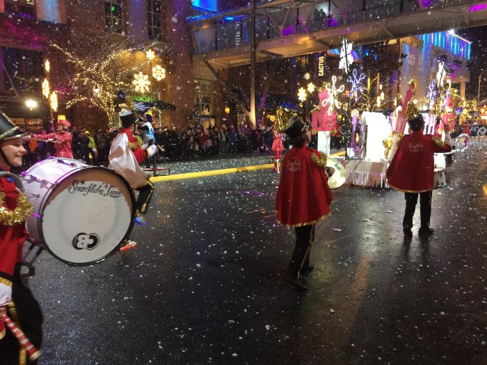 Bellevue turns out quite a celebratory Americana Christmas parade when Bellevue Way between NE 4th and NE 8th Streets turns into a snowing fantasy world complete with music, dancers, floats and festive lightning! This free showstopper features flurries of snowflakes falling all through the sky every night from 7:00pm-7:30pm through Christmas Eve! Come early (we arrived at 6:30pm) to stake a spot on the sidewalk, feel the anticipation and be greeted by parade members handing out candy and welcoming guests to Snowflake Lane!