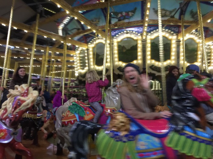 Mama’s best friend “Auntie Jessica” came up from Portland to visit with her girls (rhymes with squirrels if you’re Lake, aka “his ‘tousins'”) and we had a general blast. To enumerate: Saturday we went to the University District Farmers’ Market, sunset beach walk at Discovery Park West Pt. Lighthouse, (We also snuck in phõ and santa photos in Ballard!) and capped the day off with carosel ride