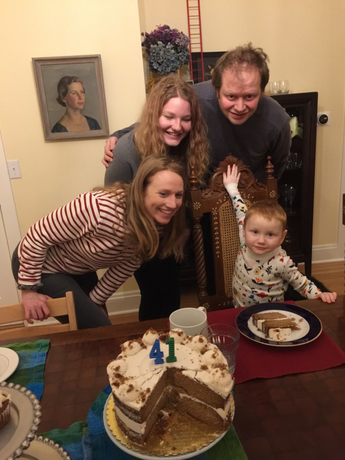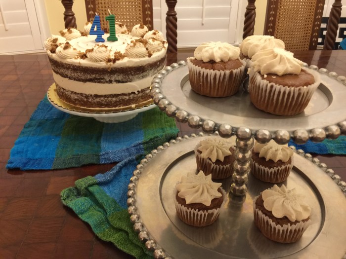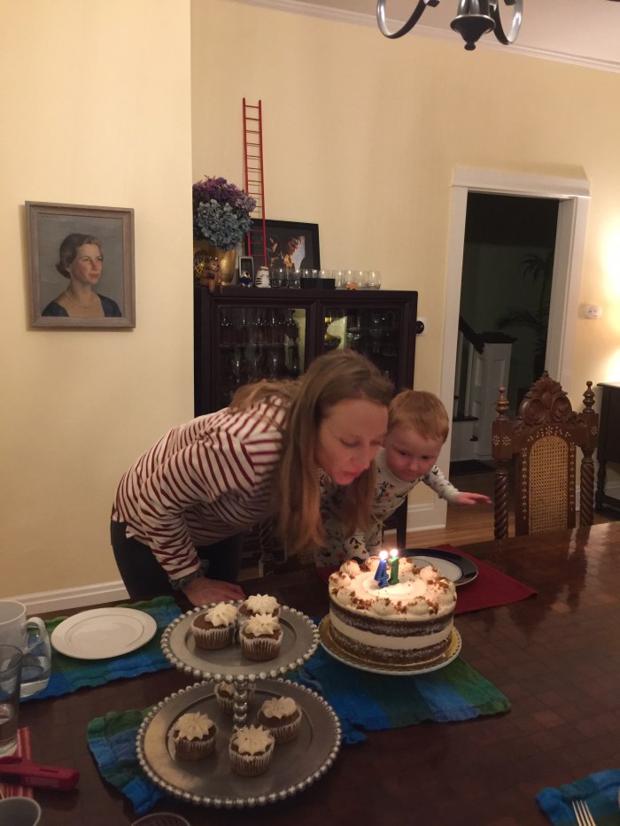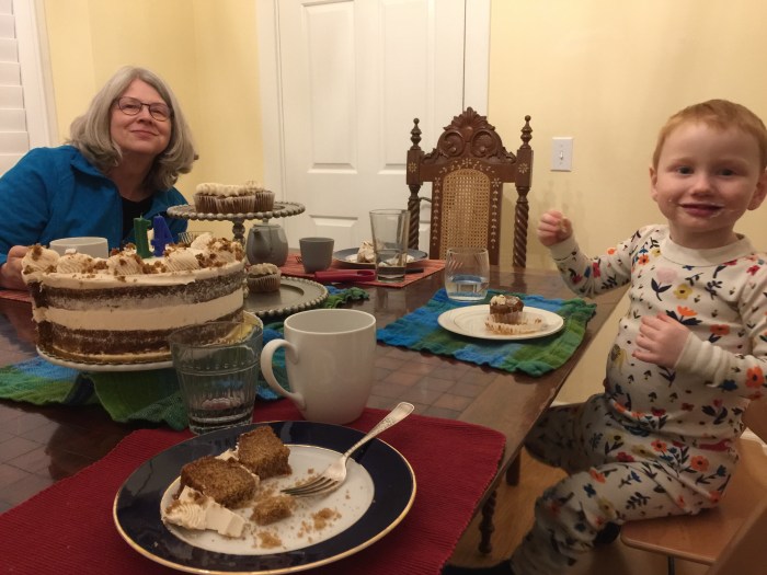 Lake loves a party. Leading up to my birthday he said it was “Mama and Lake’s Birthday.” He got very excited about the cake. The minute the cake and the cupcakes appeared nearing the end of dinner he started dancing around. “It’s a party! It’s a party! It’s a party!” And what a cake! It was a gorgeous gluten-free vegan cake Michael ordered from Flying Apron. In the morning after our cake party, Lake told me: “I had fun at the party with Jamma Julie, and Mama, and Lake and Michael and Luisa… and I ate cakes!”