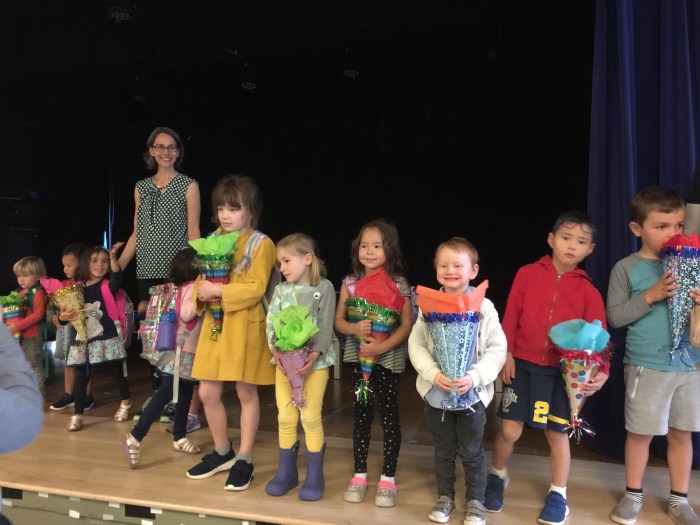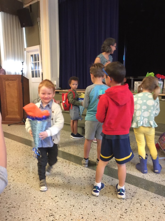 The teacher and teaching assistant Zoë had made each student a bouquet filled with candies, school supplies and treats. It’s called a Schultüte or “School Cone” and each child gets one on the first day of their school career, generally when they enter school for the first time at six years old. How special! Lake is starting a little early at three years old, but he fits right in with the four year olds ( and there is one other three year old, a teacher’s son).