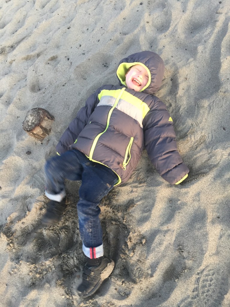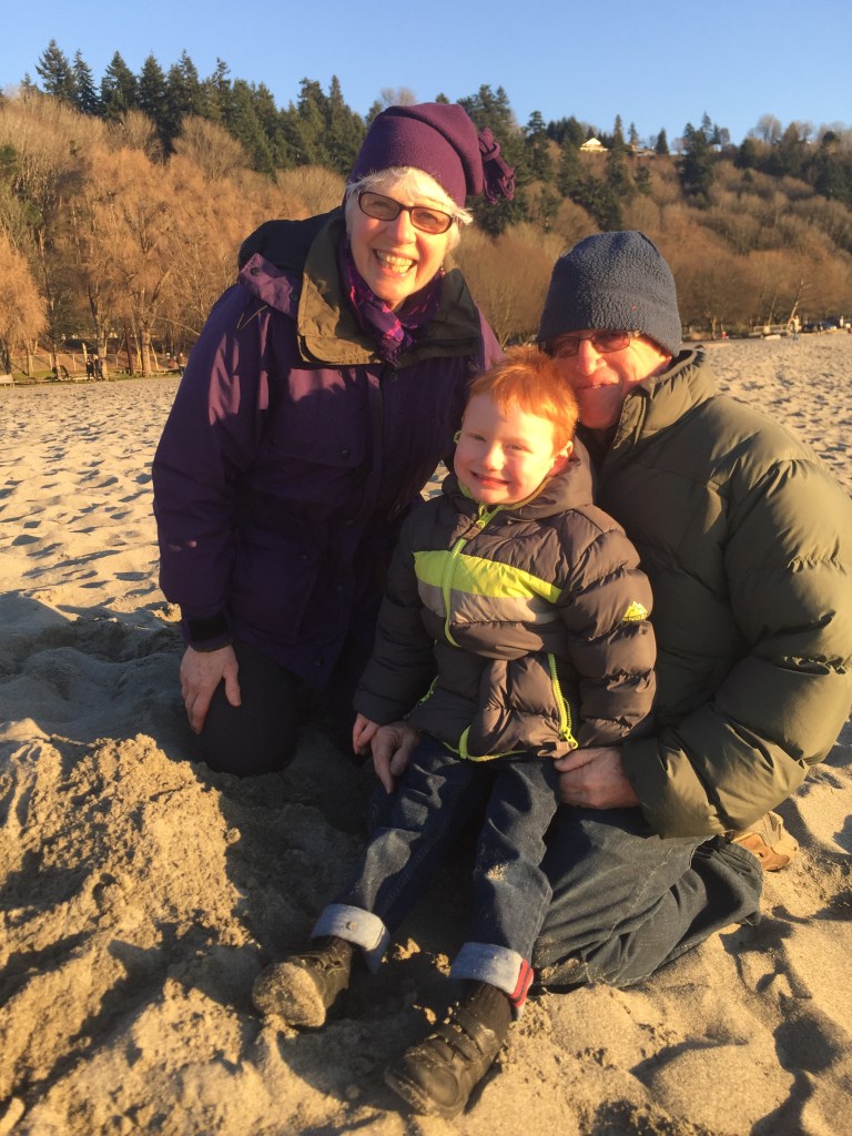 Golden Gardens Park is a little treasure of sandy beach in North Seattle. NanaBaba are golden grandparents. We came out for the last rays of sunshine on one of the first really brilliantly sunny days of the year. But… still bitingly cold, especially with the wind. Well, it is February! Didn’t bother Lake a bit; he had a hilarious time in spite of the cold. He was making dinner in the sand (salt, pepper and tofu), sand angels and planning for camping outside overnight. And laughing out loud the whole time!