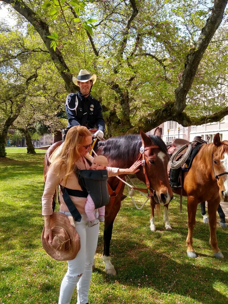 Who knew there was a cavalry of eight horses on the Seattle Mounted Police Unit? Michael and I sure didn’t! In our collective forty years of living in Seattle neither of us had seen nor heard of their existance. So it came as a delightful surprise when out walking with a friend to stumble on Mounted Police horse trailers, and later to find them in “action”. We met six of the team (three human and three equine) on the more or less deserted University of Washington campus. In the shade of the infamous cherry trees of the quad we chatted with the friendly unit. They were charismatic police embassadors and encouraging of us to pet Sherman as ridden by Officer Chase. I was a huge fan and Lady Kitty was not shy. It was the highlight of our walk, (and my day), so I was thrilled to be able to share this with you, dear reader!
