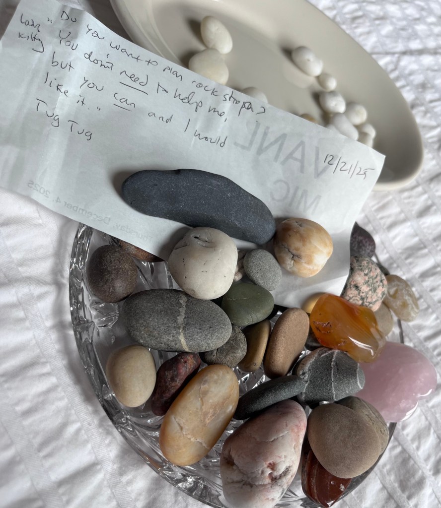 I do not recall what I was doing in that moment of the Rock Shop invitation, or how I responded to the *Tug*. The days and what they encompass of parenting have a funny way of distorting time. Distress amplifies some moments and days seem to leapfrog in a blur from one challenge to the next. Meanwhile, time overall collapses; where did it go? Each beautiful moment is presented as an offering before vanishing. How do I remind myself to cherish the present moment, again and again and again? It is here, Dear Reader, where I reflect with gratitude, that perspectives can shift. Precious exchanges can be relished and hardships relinquished. Sharing the interactions that brought me bemusement and warmth allows me to savor the connection once more.