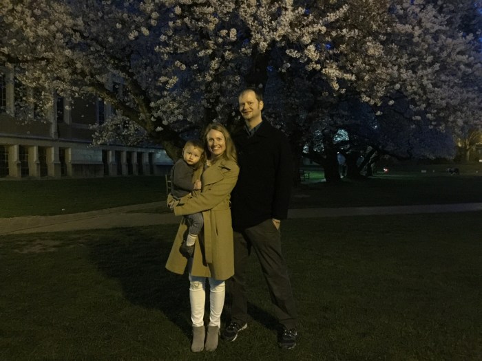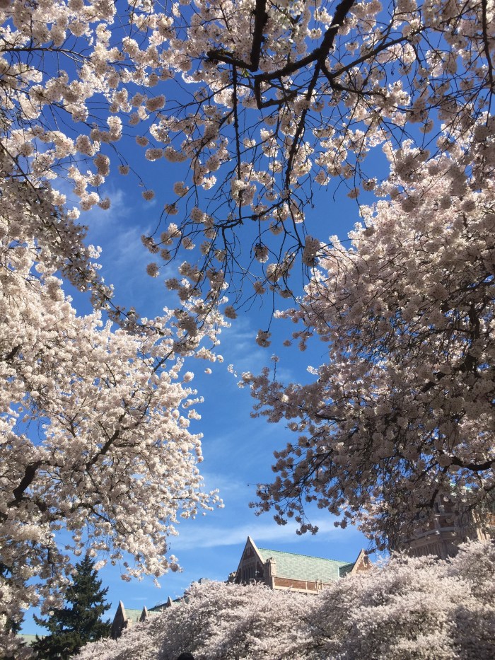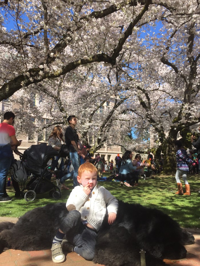 Lake being sick with the stomach flu didn’t stop us from getting a little fresh air this evening and some cherry blossom viewing. The cherry blossoms of the University Of Washington are for us a truly a magical tradition. Although Lake is not so impressed. Nonetheless we reverently walked laps around the quad, all wreathed with flowers, as the dusk turned to night.