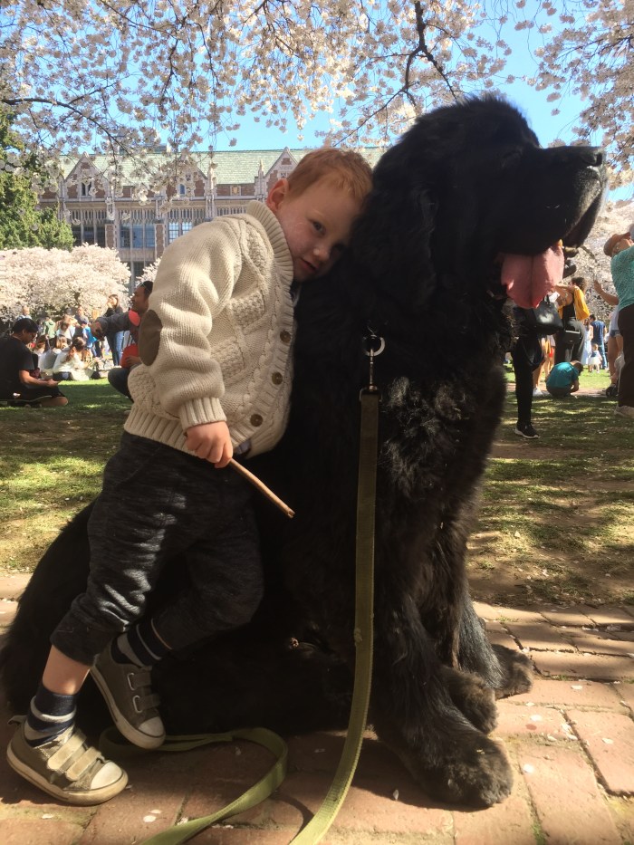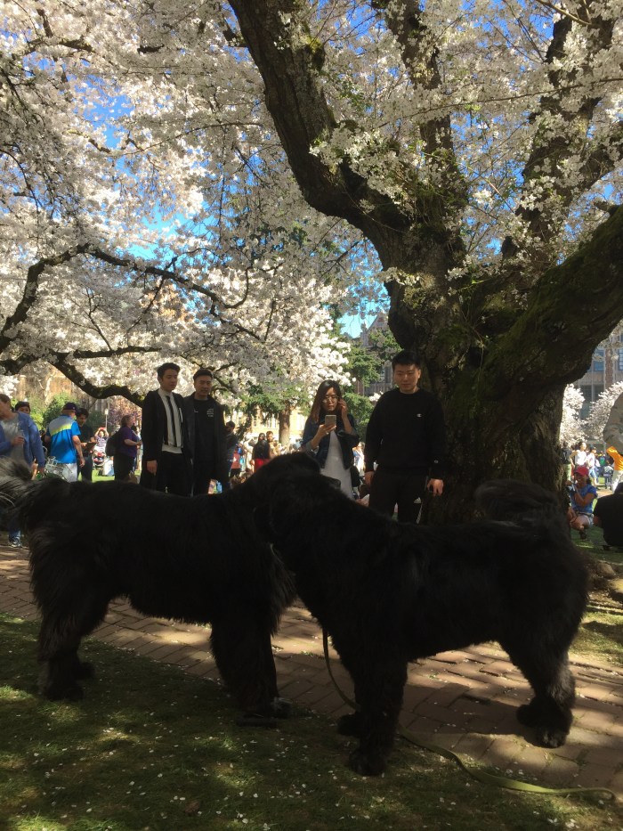 We spent four hours on Sunday afternoon at the University of Washington Quad touring the de facto Cherry Blossom Festival. Lake and Langley and I. Plus a zillion others. It was a festive zoo. With surmountable difficulties we were able to meet up with some other Newfoundlands from the Newfoundland Club of Seattle. Lake was excited to look for James Bond (225# Newfie and 3 years old) in the crowd. As it turned out Langley was pretty happy to find him too. Sightseers effectively forgot about the cherry blossoms when we walked by. Langley is a showstopper. Everyone’s enamored with Langley. He is the strikingly handsomest Newfoundland we’ve ever seen. While James Bond may be the prince, Langley holds his own as the regal king. We held court in the shade of the blossom-filled sky and enjoyed to no end the enchanting floral canopy above.