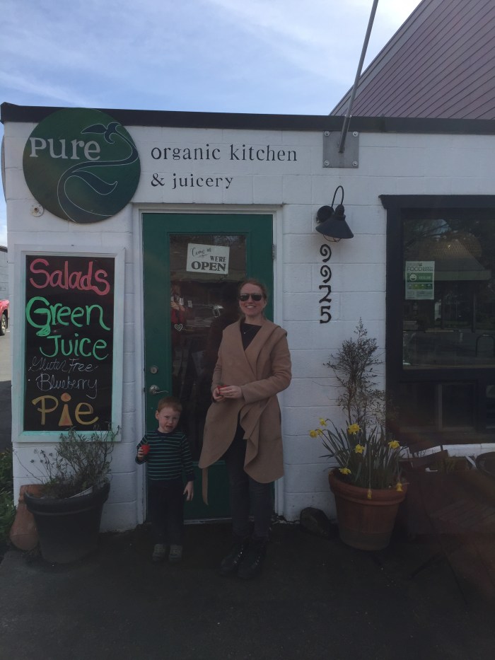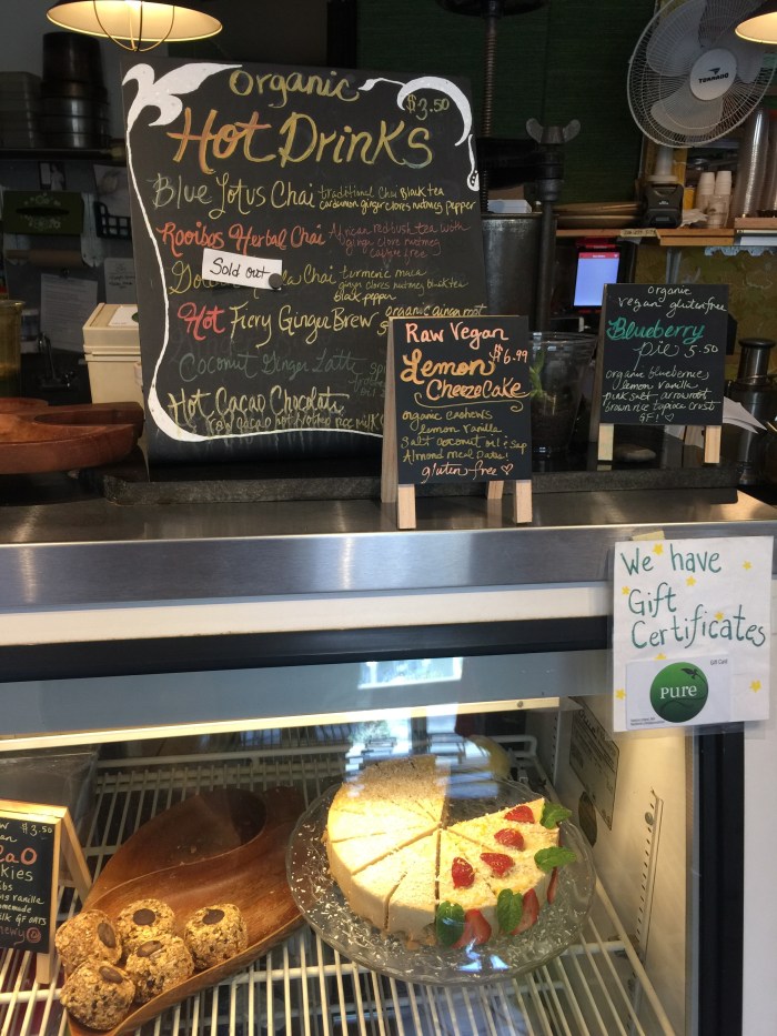On Vashon Island we found the Pure Organic Kitchen and Juicery. A tiny establishment with an “excellent” food handling rating, a rare distinction among vegan restaurants. One must exit the café and enter through the back door to access their one (very clean) bathroom; that’s how small it is. It was modern and delicious and we gobbled up their tasty treats- “one of each please!” I especially liked their kale pizza for its inventiveness and attractive presentation. Also refreshing and delicious!