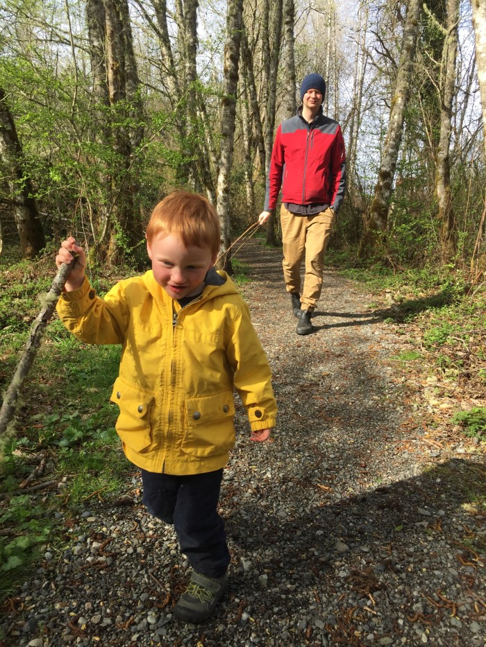 We explored some of the 10 miles of trails of Island Center Forest during our Vashon Island Weekend. It was refreshing to see all the green of springtime unfurling. Lake is carrying on Michael’s tradition of having a stick in hand while walking or hiking. We encountered only one other trail user during our day hike: a woman bicycling her dog. Vashon is a well-kept secret.