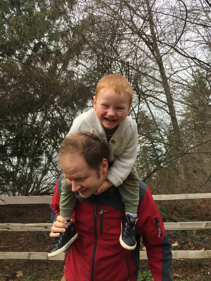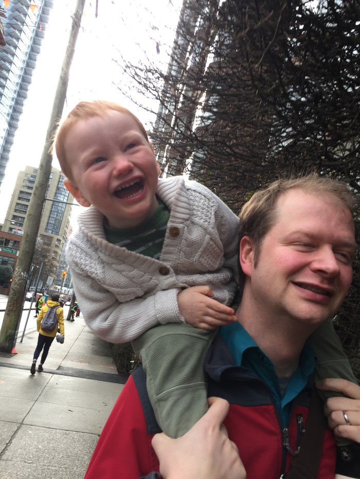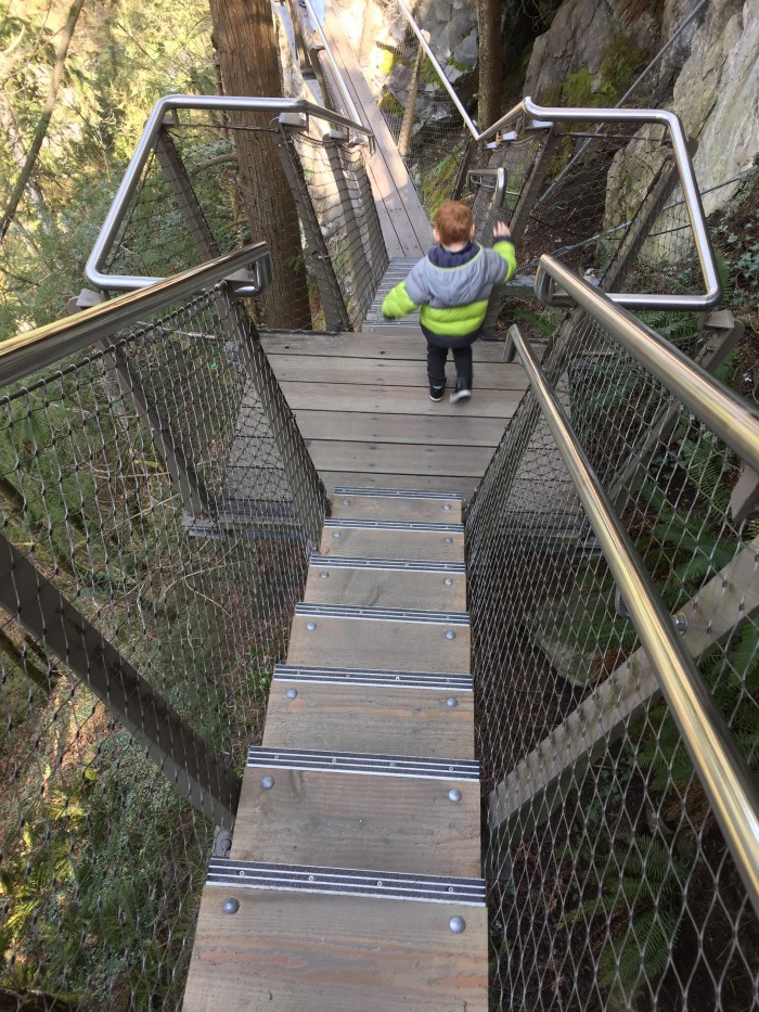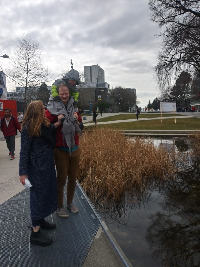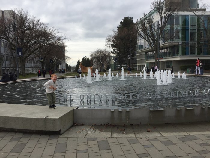 He was running all around their water features and we thought, it’s only a matter of time before he falls in. He actually cleared the fountain. Then, as we were heading out, he tipped over into their central campus entrance water feature, a chain of ponds and gentle waterfalls. As I came running he actually turned around so fast and scrambled up onto the walkway again. By the time I got there he was just coming up for air. I wasn’t sure if his exhale was going to bring laughter or tears. It turned into the biggest shocked horrified bloody murder scream. And as he tells the story, he went Sploosh! And Mama got him dry. Indeed, we directly stripped off all his drenched clothes right here in the middle of campus and quickly cobbled together a dry outfit: his jacket he was luckily was wasn’t wearing, our last dry diaper, mama’s socks, and Luisa’s scarf.