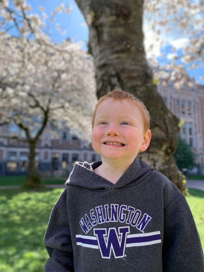 In keeping with our college tour theme (UBC, then UW), Lake posed for a collegiate photo shoot at the UW Quad earlier this week in celebration of the cherry blossoms having popped. Somehow the lovely young German au pairs bring out that charming side of him for pictures that I really don’t have the talent for these days. Photo credits Luisa Jehle.
