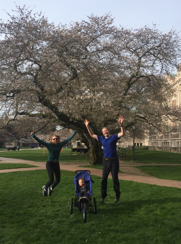This morning we woke up running! So we ran directly to the Quad to check on the University of Washington cherry blossoms. They are out! The highlight of our year in the neighborhood.