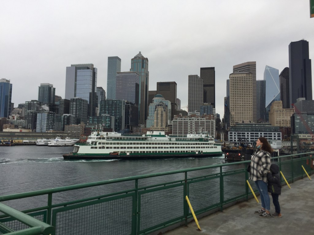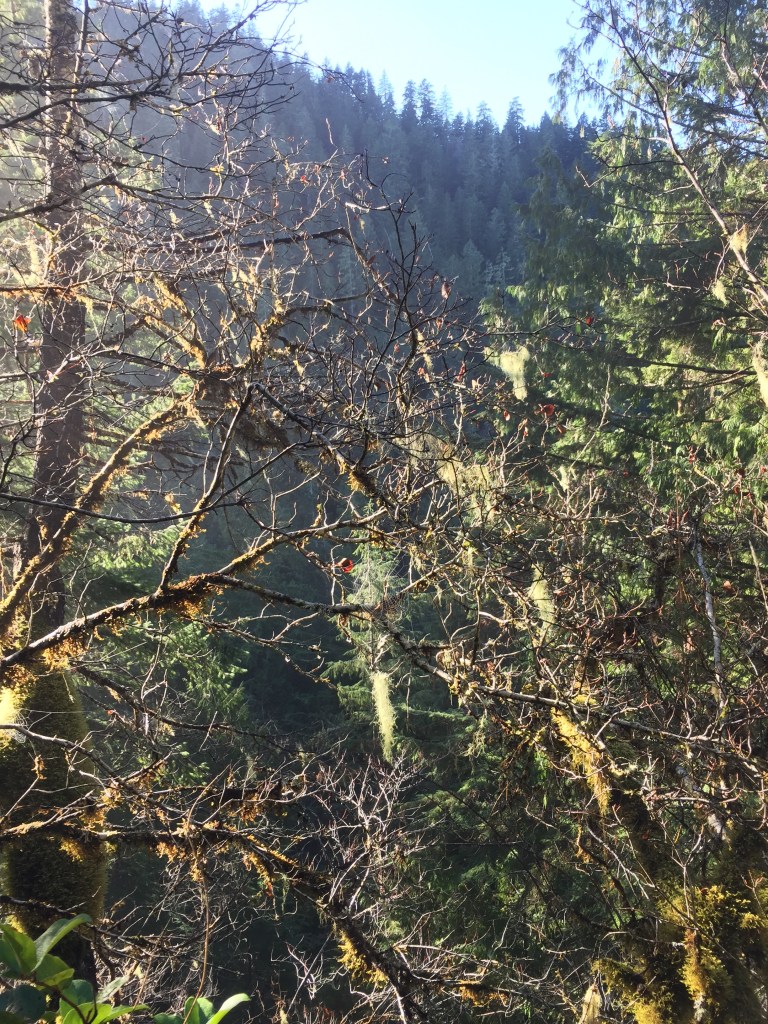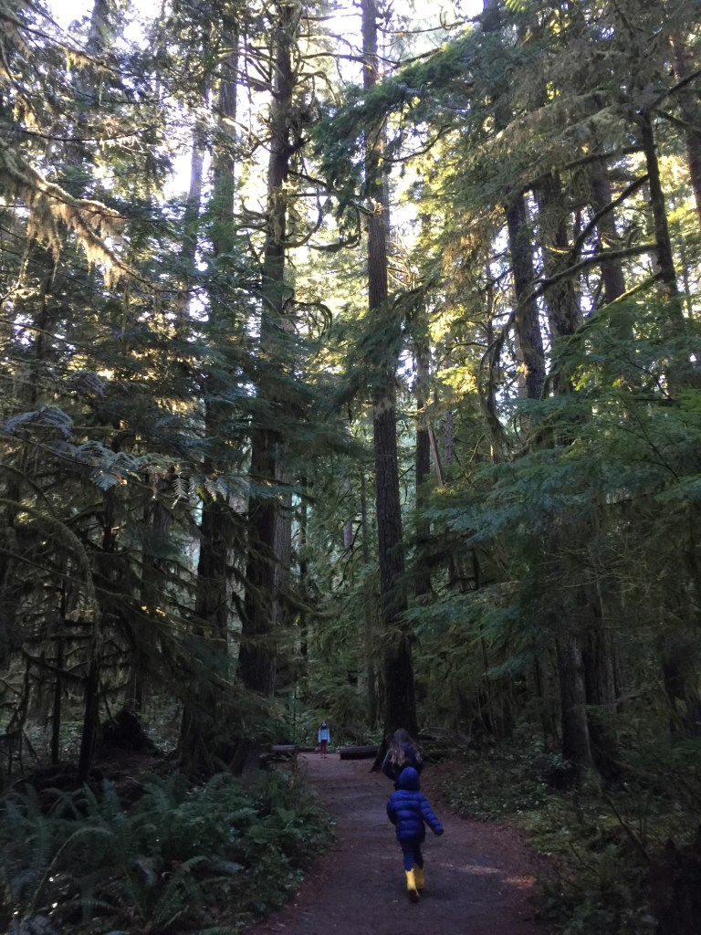 We walk past glossy dark-green sword ferns that would dwarf those in our garden at home, thriving in their natural habitat at twice the size of their urban brethren. Pools of standing water shimmer inky black broken only by Skunk cabbage sprouts and by silver rings pulsating outward from tree drip raindrops. The forest is black and green, stark and gothic in the deep of winter.