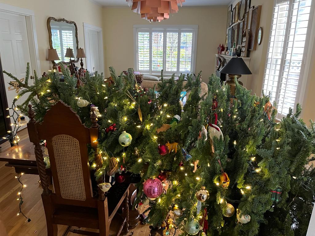 As with so many of our plans in life, they don’t always go without mishap along the way. That’s what makes the Story! That’s what makes the Story of Birth to Death unique to us and our family. So it was with our beautiful tree. Once we got it home and prepared the tree to place in the tree stand, we discovered that one or two of the bolts/nuts was stripped, giving the tree a strong lean. One day the water got low, and it turned out the necessary ballast was no longer present anchoring the tree. TIM…ber… it tipped over. That’s the story. Madeline and I swept up the glass, righted the tree, and added more water to anchor it. Michael added some fishing line guy wires later. The tree is tied up now and all is good so far. Probably we should get a heavier tree stand to adequately support any of these future tall majestic Christmas Trees from the Aberdeenshire.